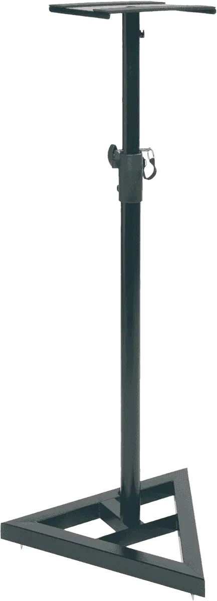 Black adjustable monitor stand with triangle base. Adjustable from 69 to 130 cm.