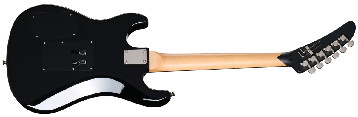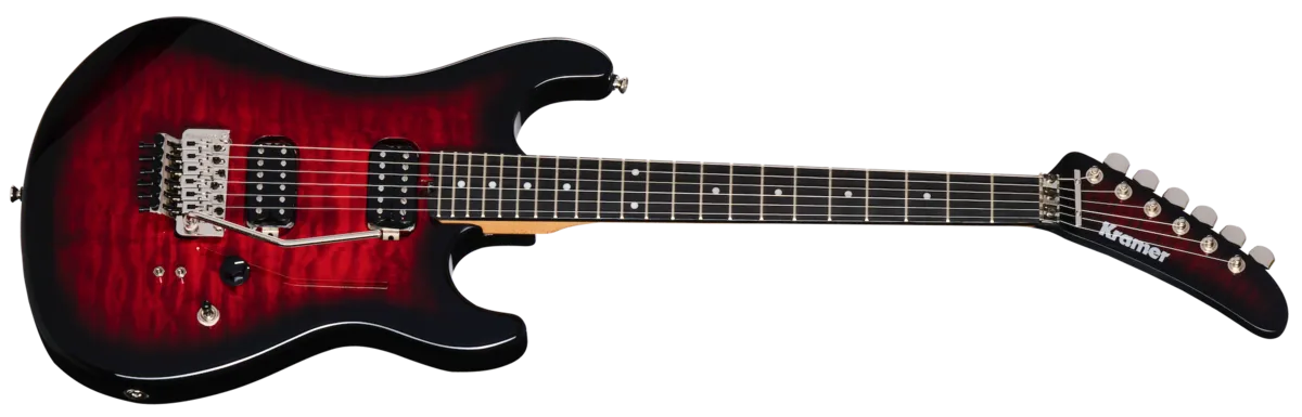 The Kramer 84 HH Quilt is an updated version of the legendary Kramer 84. While it has expanded features, we've kept all of the Made to Rock Hard Kramer attitude of the originals. The Kramer 84 HH Quilt is outfitted with an alder body with a gorgeous AAAA quilt maple veneer top. The body is equipped with a Floyd Rose® 1000 Series tremolo paired with an R2 locking nut for vibrato bar gymnastics without the worry of knocking things out of tune. The neck is a thermally aged bolt-on hard maple neck with a satin finish and an ebony fretboard that has 22 jumbo frets and pearloid dot inlays. The neck has a Kramer SlimTaper™ C profile that is thin and fast, so it is ideal for shredding. The fretboard features a compound radius that is 10" at the nut and flattens out to 14" further up, so playing first-position chords iS easy while allowing you to play deep string bends further up the neck without the notes fretting out. The dual-action truss rod is adjusted with a spoke wheel-style truss rod adjustment nut, which is positioned at the end of the fretboard for unfettered access. The body's gloss finish is duplicated on the front of the 84 non-angled big banana headstock, and the front of the headstock has a matching quilt maple veneer. The 84 HH Quilt's headstock has a classic Kramer logo, is fitted with die-cast tuning machines, a nickel string retaining bar, and has a wrench holder for the Floyd Rose on the rear, so you'll always have the tools to adjust the tremolo on hand. The updated electronics feature a pair of Kramer USA-made Eruption pickups that were designed by Gibson Master Luthier Jim DeCola. Instead of having mounting rings, the pickups are screwed directly into the body for enhanced sustain. A 3-way toggle pickup selector switch allows you to use each pickup by itself or together, and two mini toggle switches (one for each pickup) are provided for coil splitting, giving you a choice of humbucker™ and single coil tones that you can combine at will. A single master volume control with a retro-style black knurled knob controls the overall volume level of both pickups simultaneously, making it easy to crank things up for your awe-inspiring solos. A Kramer premium gig bag iS included with the Kramer 84 HH Quilt to keep this Made to Rock Hard shredder safe when you're traveling to your next gig.