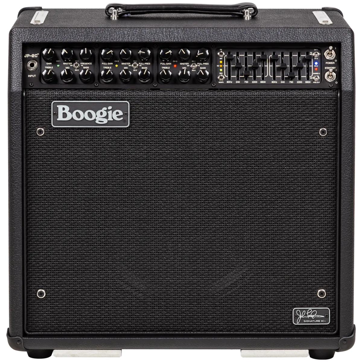 Much like a race car or fighter jet, the JP-2C strips down to bare essentials to get the job done effectively and in the simplest way. It's a purpose-built, no-compromise rendering that aims at one single goal; provide the most aggressive, purest sounding lIC+ in a versatile package that delivers the goods to meet John's recording and stage needs. The JP-2C offers the highest headroom Clean sounds of any Mark Series amp, one Boogie Lead Channel for tight, grinding rhythm work, and a slightly higher gain Boogie® Lead Channel, with access to even more saturation yet the ability to track any technique and speed while also reaching to the stratosphere for single note solos. In that spirit, unlike other MESA amplifiers, the JP-2C foregoes the concept of multiple voicing Modes per channel and instead dedicates each of the three Channels exclusively to one of two voicings from the MARK IIC+. In Channels 2 and 3, it also adds a SHRED Mode, which further enhances the top-end harmonic layering of the original lIC+ Lead Circuit.