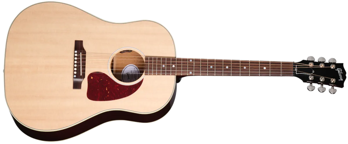 The J-45™ is Gibson's best-selling acoustic of all time. Nicknamed "The Workhorse" and first introduced in 1942, this iconic acoustic has become the cornerstone of its round-shoulder, dreadnought line. World-renowned for its full, balanced expression, warm bass, and excellent projection, the J-45 has been refined to carry this legacy to new heights. The Gibson J-45 Standard delivers a sound with incredible dynamic range, warm mids, and tight, punchy bass. Now available in Antique Natural VOS, it is equipped with an L.R. Baggs™ VTC under-saddle pickup and preamp system, making it stage and studio-ready from the moment you take it out of the included hardshell case.