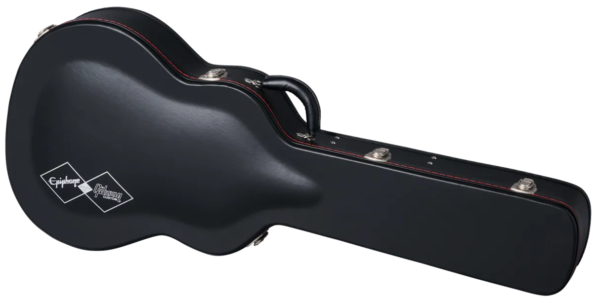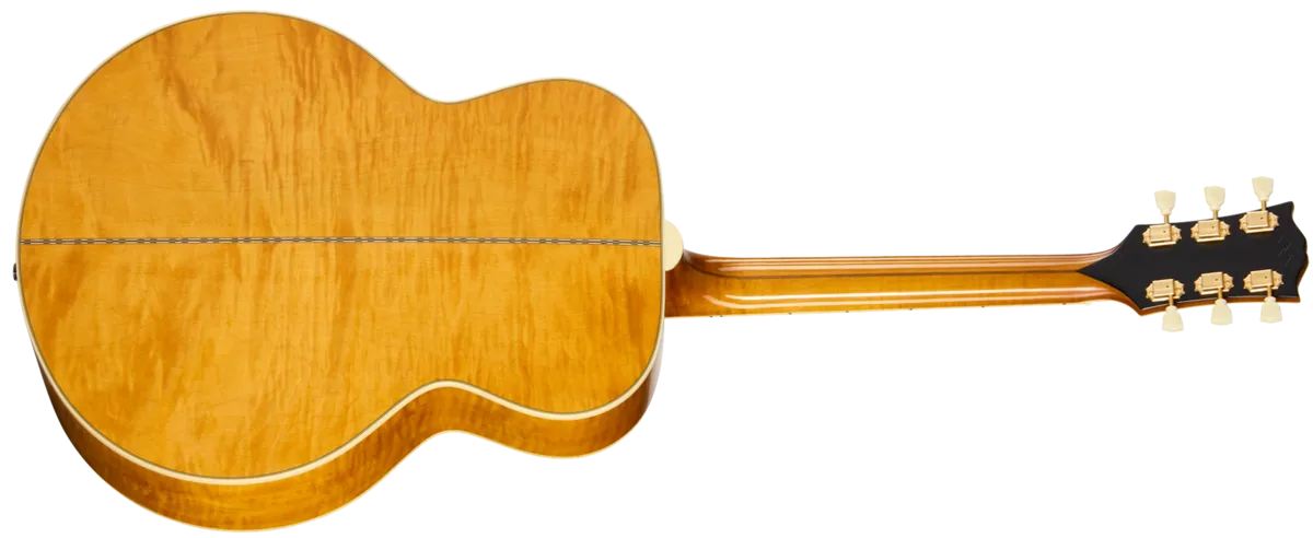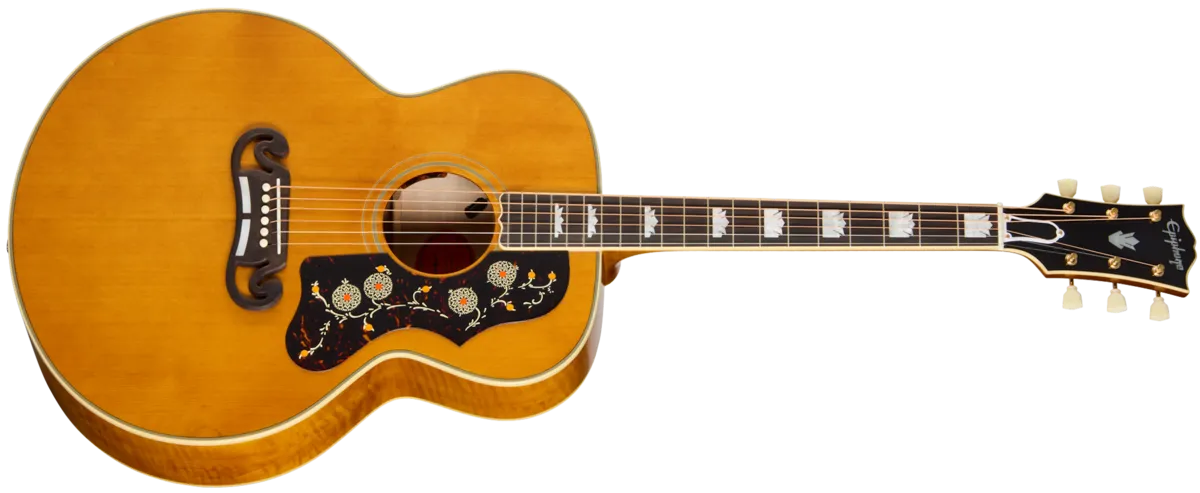 The Gibson SJ-200 ™ was introduced to the world in 1937 and quickly earned the nickname "the King of the Flat-Tops" due to its physical size, high-quality sound, exceptional projection, and undeniable stage presence. While the early models used rosewood, in 1947, the wood used for the sides and back changed to maple. The SJ-200 has been used by everyone from matinee cowboys to folk troubadours, country crooners to rock royalty, and vintage SJ-200 models are in high demand among collectors. Now, Epiphone, in collaboration with Gibson Custom, is proud to introduce the 1957 SJ-200 Reissue, an Inspired by Gibson Custom recreation of the majestic 1957 Super Jumbo model, making it more accessible for today's guitarists to enjoy. The Epiphone 1957 SJ-200 Reissue is packed with vintage-inspired details and features all solid wood construction, including a thermally aged solid Sitka spruce top that is reinforced with scalloped X-bracing, solid figured maple back and sides, multi-ply top and back binding, a two-piece flame maple neck with a walnut stringer, comfortable C profile, and a bound Indian rosewood fretboard with mother-of-pearl graduated Crown inlays and 20 standard frets. The neck is attached to the body with a glued-in dovetail joint. The SJ-200 style pickguard has vintage-style graphics, and the rosewood SJ-200 open two-bar Moustache™ bridge has mother-of-pearl inlays. The nut, compensated saddle, and bridge pins are all made of bone. The bound, Gibson-style "open book" headstock features the Epiphone logo and Gibson Crown inlaid in mother-of-pearl. The rear of the headstock of the Antique Natural model has a stinger (there is no stinger on the Vintage Sunburst version), and the 1957 SJ-200 Reissue also has an Inspired by Gibson Custom Double Diamond logo etched on the headstock rear. To make it even more suitable to the needs of modern musicians, it comes with an under-saddle L.R. Baggs™ Element Bronze VTC piezo pickup and active preamp with soundhole-mounted volume and tone controls pre-installed, so it is stage and studio ready, straight out of the included Red Line-inspired hardshell case, which features Inspired by Gibson Custom graphics.