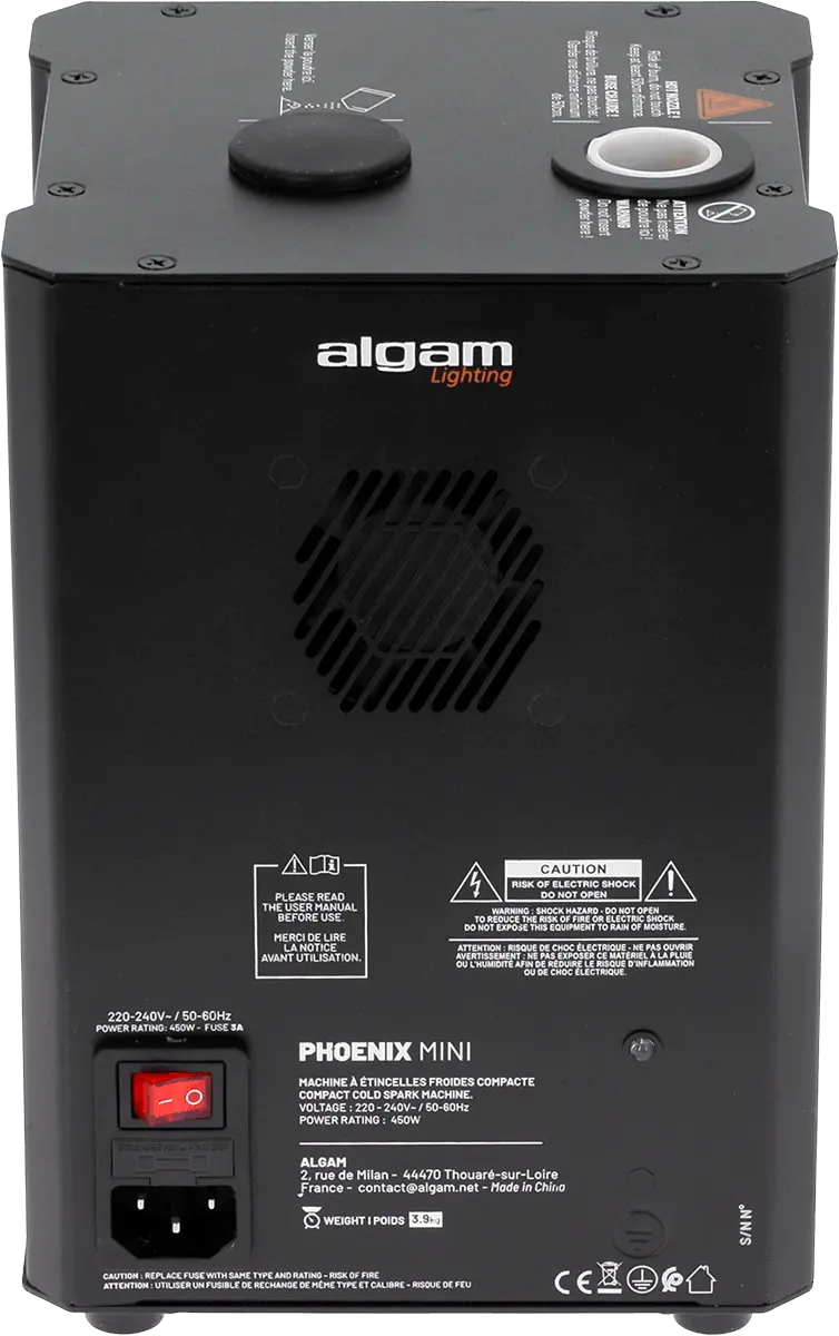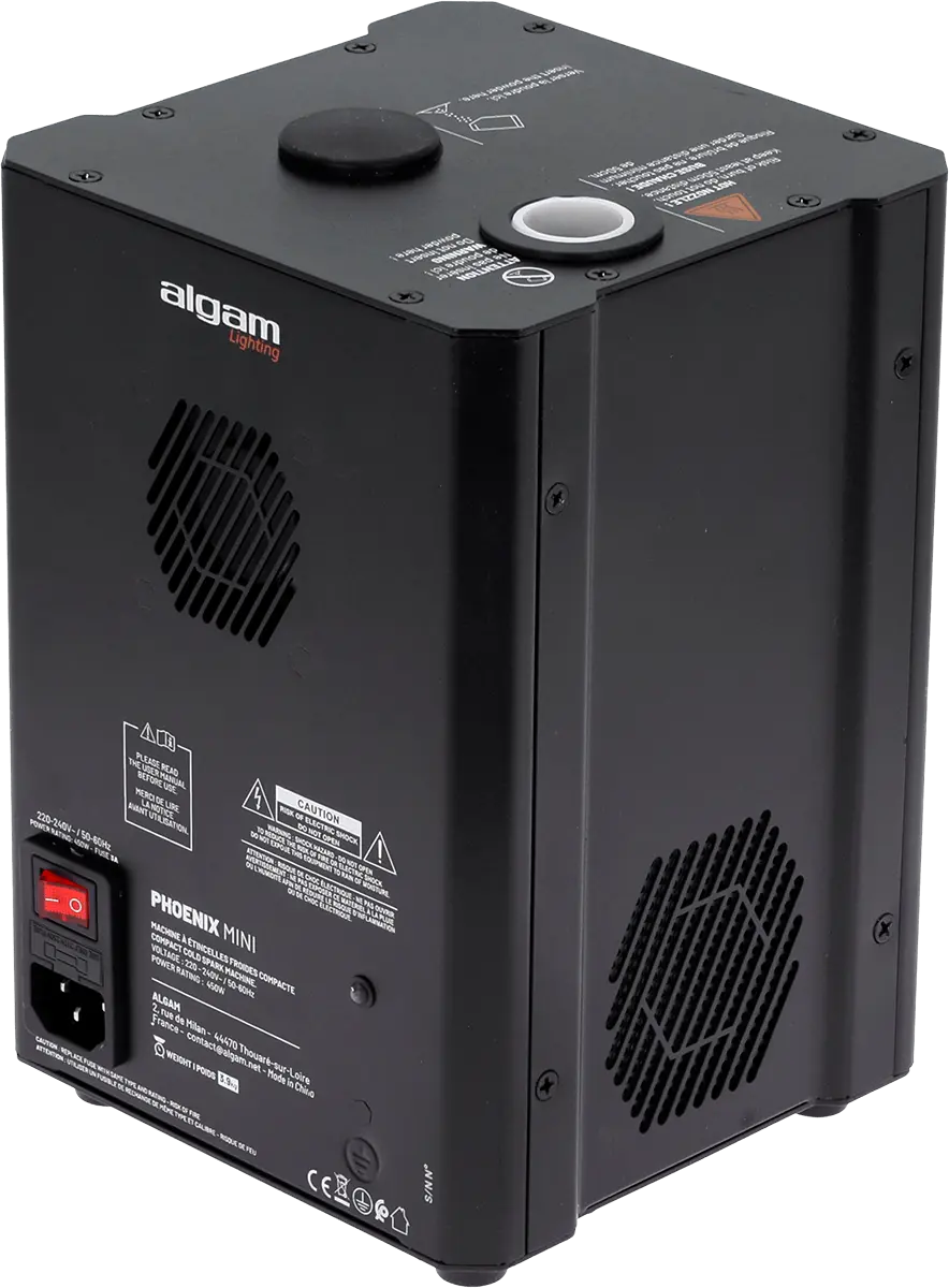 Spectacular, compact, and safeThe Phoenix Mini proves that you don’t need to be large to create a grand effect. With its 450W of power, it projects bright cold spark fountains up to 5 meters high, without dangerous heat or smoke. Perfect for highlighting a key moment or marking a finale, it delivers a result worthy of the biggest shows, while remaining safe for indoor and outdoor use. An elegant solution that amazes without risk to your guests.Quick to set up, simple to controlThanks to its short heating time of just 3 to 5 minutes, the Phoenix Mini is ready to light up your event in an instant. Whether it’s for a wedding, concert, or private party, it easily fits into your stage setup. It is easily controlled using the remote control provided, allowing you to manage the projection time and cleaning cycle. This lets you match the effect to your show’s rhythm for consistently striking results.Lightweight, practical, and designed for eventsWith compact dimensions of 160 × 165 × 240 mm and a light weight of just 3.9 kg, the Phoenix Mini is easy to transport and installs in minutes. Its small size makes it simple to integrate into any setup, even in the most limited spaces. Designed for mobile service providers and demanding organizers, it combines convenience and visual impact, guaranteeing a “wow” effect every time. A machine that blends mobility, performance, and reliability to make your events shine effortlessly.