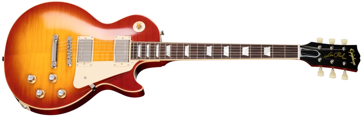The 1960 Gibson Les Paul™ Standard is one of the world's most coveted vintage guitars. It has been embraced by such luminaries as Eric Clapton, Paul McCartney, and Joe Walsh. The 1960 Les Paul Standard iS very similar to the famous 1959 model year that preceded it, but with a few changes, most notably, a thinner and faster-playing SlimTaper™ neck profile that many players prefer over the somewhat beefier 1959 Les Paul Standard neck profile. Now, Epiphone is proud to introduce the Epiphone 1960 Les Paul Standard Reissue, a beautiful recreation of those vintage 1960 Les Paul Standard models. Made in partnership with Gibson Custom, the Epiphone Les Paul Standard 1960 Reissue delivers vintage Les Paul looks and performance at an accessible price. All of the classic appointments the 1960 Les Paul Standard model is known and loved for are present here, including a one-piece mahogany neck with a long neck tenon for increased stability and sustain, a comfortable, fast-playing Slim Taper™ profile, and a bound rosewood fretboard. It also features mother-of-pearl trapezoid fretboard inlays, an aged mother-of-pearl Epiphone headstock logo, and the words "Les Paul Model" silkscreened in gold on the Gibson-style "open book" headstock. Even the side dot position markers are the same size as on vintage 1960 Les Paul Standard models and are placed in historically accurate locations. The genuine mahogany body features a carved maple cap that is topped with a beautiful AAA flamed maple veneer. The electronics are equally impressive, with two USA Gibson Custombucker humbucking pickups with Alnico 3 magnets that are hand-wired to CTS® potentiometers, Black Beauty paper-in-oil capacitors, and a Switchcraft® pickup selector toggle switch and output jack. The Vintage Gloss finish gives the guitar a vintage appearance without looking overly aged and is nicely complimented by the nickel hardware, including the Epiphone Deluxe "Double Ring" Keystone button tuners. A Brown hardshell case with Inspired by Gibson Custom graphics and a pink plush-lined interior is also included. This is the perfect Les Paul for players who love the vintage appeal of the classic 1959 Les Paul Standard but who want a more comfortable neck profile.