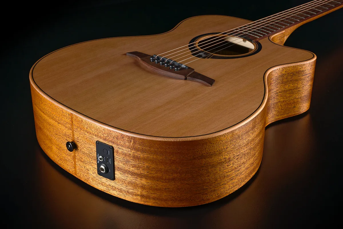 The HV10ACE blends the comfort of an auditorium body with the groundbreaking features of the HyVibe H2 preamp. Its solid red cedar top offers warm, detailed tones, while the Khaya mahogany back