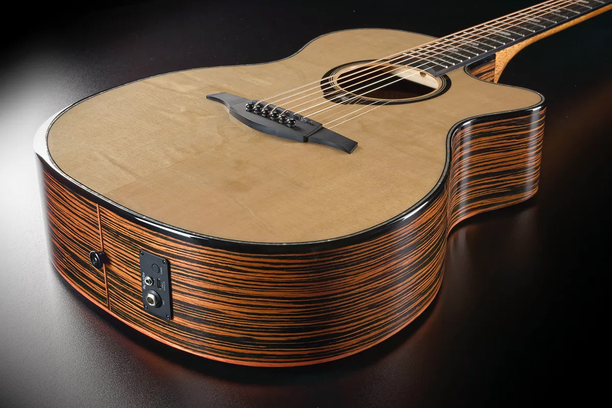 while the Macassar ebony back and sides add depth and warmth to the sound. Its cutaway design allows for easy access to higher frets, ideal for intricate playing styles. The ergonomic armrest bevel