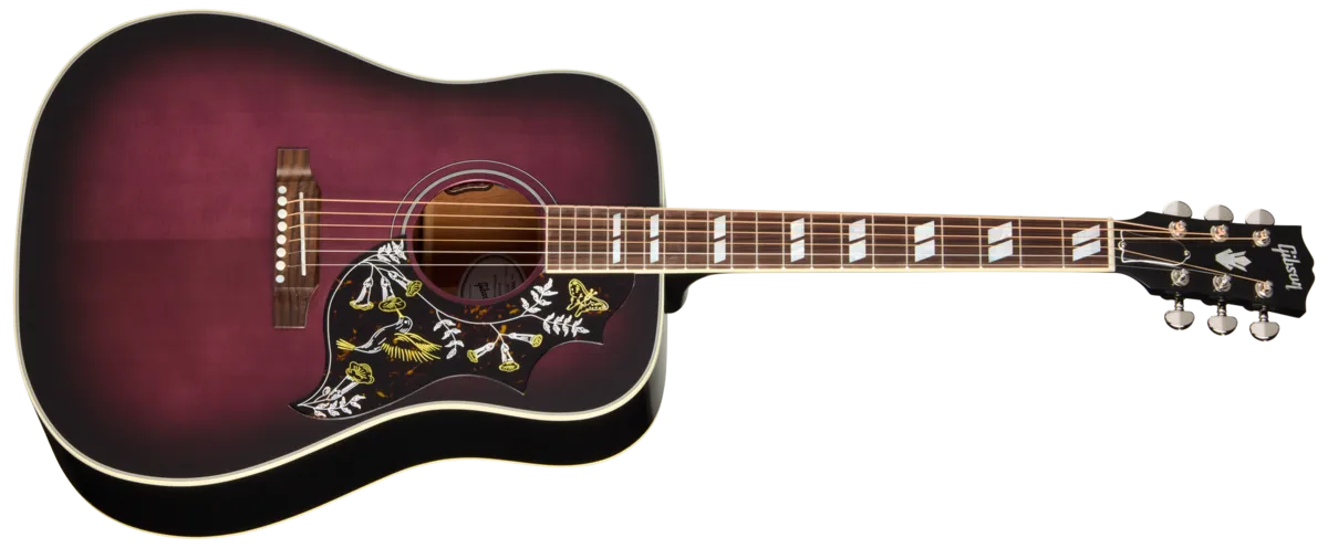 Much of the Hummingbird's appeal lies in its versatility. No matter how you attack this flat-top, it pumps out rich, deep tones, and is equally at home strumming first-position chords as it is taking the spotlight for picking lead lines. This versatility has made it the choice of musical legends across genres. Its spacious mahogany body and sweet, select Sitka spruce top are more than capable of nailing down the rhythm in the hands of a rock and roll sideman or accompanying the most nuanced performance under the fingers of today's alternative singer-songwriter. The Hummingbird's mahogany neck has a comfortable, Rounded profile and is adorned with classic mother-of-pearl parallelogram inlays. It is fitted to the body with a compound dovetail neck joint for outstanding resonance and sustain. This 'bird has a TUSQ® nut, saddle, and bridge pins. The low-friction TUSQ nut, along with the Grover® Rotomatic® tuners, ensures solid tuning stability, so you can spend more time playing and less time tuning. The Hummingbird Standard also sports the iconic Hummingbird ™ graphics on the pickguard, and is equipped with L.R. Baggs® VTC electronics, so it's ready to plug in on stage or in the studio, from the moment you take it out of the included hardshell case.