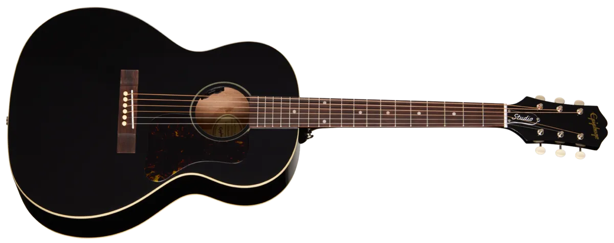 The Epiphone Blues King Studio is part of the all-new Epiphone Studio Acoustic Collection. These guitars have been completely reimagined to offer the most authentic and affordable acoustic guitars inspired by iconic Gibson designs. The Blues King Studio delivers a delightful blend of vintage charm and modern craftsmanship and was designed to deliver a soulful and resonant sound that's perfect for blues and folk enthusiasts. Based on classic Gibson parlor acoustics, the Blues King Studio's smaller parlor-sized body and shorter 24.75" scale length make it an excellent choice for a first guitar for younger players and a solid choice for smaller-statured players. Its bluesy tone is ideal for fingerstyle, blues, folk, Americana, and other traditional music styles. The Blues King Studio has a layered, L-00-style mahogany body with single-ply cream binding on the top and back and a solid spruce top for a responsive, balanced tone with excellent dynamic range that sounds even better as it ages. The mahogany neck is attached to the body with a glued-in tapered dovetail neck-to-body joint and features a comfortable Rounded C profile. The neck is capped with a rosewood fretboard equipped with 19 standard frets and adorned with simple pearloid dot inlays. The other ends of the strings are routed over a compensated plastic saddle and are anchored to the rectangular rosewood bridge with ivory-colored bridge pins. We also included other details that give the Blues King Studio even more vintage-style flair, including an L-00-shaped dark tortoise shell-colored pickguard, three-on-a-plate tuners with ivory-colored plastic buttons, and a 60s Kalamazoo-style headstock with the Epiphone logo proudly displayed in gold silkscreen. The Blues King Studio comes with Fishman electronics, including an S-Core under-saddle pickup and Fishman Presys VT preamp with soundhole-mounted volume and tone controls that deliver quick and easy access for the player while remaining all but invisible to the audience. The Epiphone Blues King Studio has a gloss finish and is offered in two vintage-approved colors-Ebony and Dark Burst. Both right and left-handed versions are available. A standard gig bag is also included.