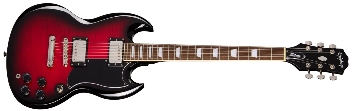 The popular Epiphone Tribute series has been a gateway into the world of Epiphone guitars for countless new players. Now, the Tribute series is expanding with the release of the new Epiphone SG ™ Tribute Plus. This affordable yet high-quality guitar is designed for beginner and intermediate-level players who want a quality guitar that won't hold them back or hinder their learning progress. The SG Tribute Plus features a classic Gibson SG-shaped body made from mahogany. It has the iconic beveled mahogany SG body with a flame maple veneer top that looks fantastic. The bolt-on mahogany neck has a fast and easy playing 60s SlimTaper™ Rounded C profile that makes practice sessions and jamming a joy, and a tapered heel joint for improved upper fret access. The headstock features the popular 60s Kalamazoo headstock shape, which is outfitted with quality die-cast tuning machines, and the bound laurel fretboard is outfitted with 22 medium jumbo frets and adorned with pearloid trapezoid inlays. The SG Tribute Plus is equipped with an Epiphone LockTone ™ Tune-O-Matic bridge and LockTone Stop Bar tailpiece that are designed for easy adjustment of string height and intonation, and they contribute to this model's excellent sustain. The Epiphone SG Tribute Plus is equipped with a pair of Epiphone humbucker™ pickups, with an Epiphone 650R in the neck position and an Epiphone 700T in the bridge position. Both pickups are furnished with powerful ceramic magnets for strong, full-bodied tone. The Epiphone SG Tribute Plus elevates the Tribute series with even more performance and better looks while remaining accessible to players everywhere. It's a great choice for your first electric guitar or as a step up from a lesser-quality instrument and will serve you well on your musical journey for years to come. An optional Epiphone gig bag or hardshell case is available separately.