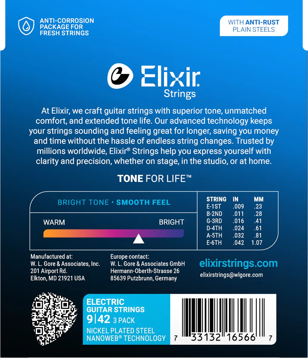 Elixir® Electric Nickel Plated Steel Strings with NANOWEB® Coating deliver the presence, punch, and personality of traditional electric guitar strings but with extended tone life.