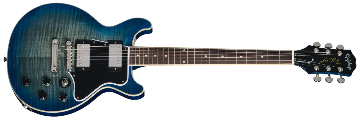 Now, Epiphone is proud to introduce the Les Paul Special Double Cut Figured. It retains all the features that make the Les Paul Special eminently playable and elevates its visual appeal to the next level. It features a Les Paul Special double cutaway mahogany body and caps it with a beautiful AAA figured maple veneer. Additionally, the top is also bound. The mahogany neck has a fast-playing SlimTaper profile and is topped with a bound rosewood fretboard that is equipped with 22 medium jumbo frets and adorned with acrylic dot position marker inlays. The 60s Kalamazoo headstock is outfitted with Grover® Rotomatic® tuners and features the Epiphone logo inlaid in mother-of-pearl. The electronics are also different than what you'll find on most Les Paul Specials. Instead of the usual P-90 single coil pickups, the Les Paul Special Double Cut Figured is equipped with a pair of Epiphone's acclaimed ProBuckerm humbucking pickups, with a ProBucker 2 in the neck position and a slightly hotter ProBucker 3 in the bridge position for blistering solos. Both pickups are wired to individual volume and tone controls, along with a three-way toggle switch for excellent tonal control and versatility. The Les Paul Special Double Cut Figured comes packed in a premium gig bag to help keep it safe when traveling.