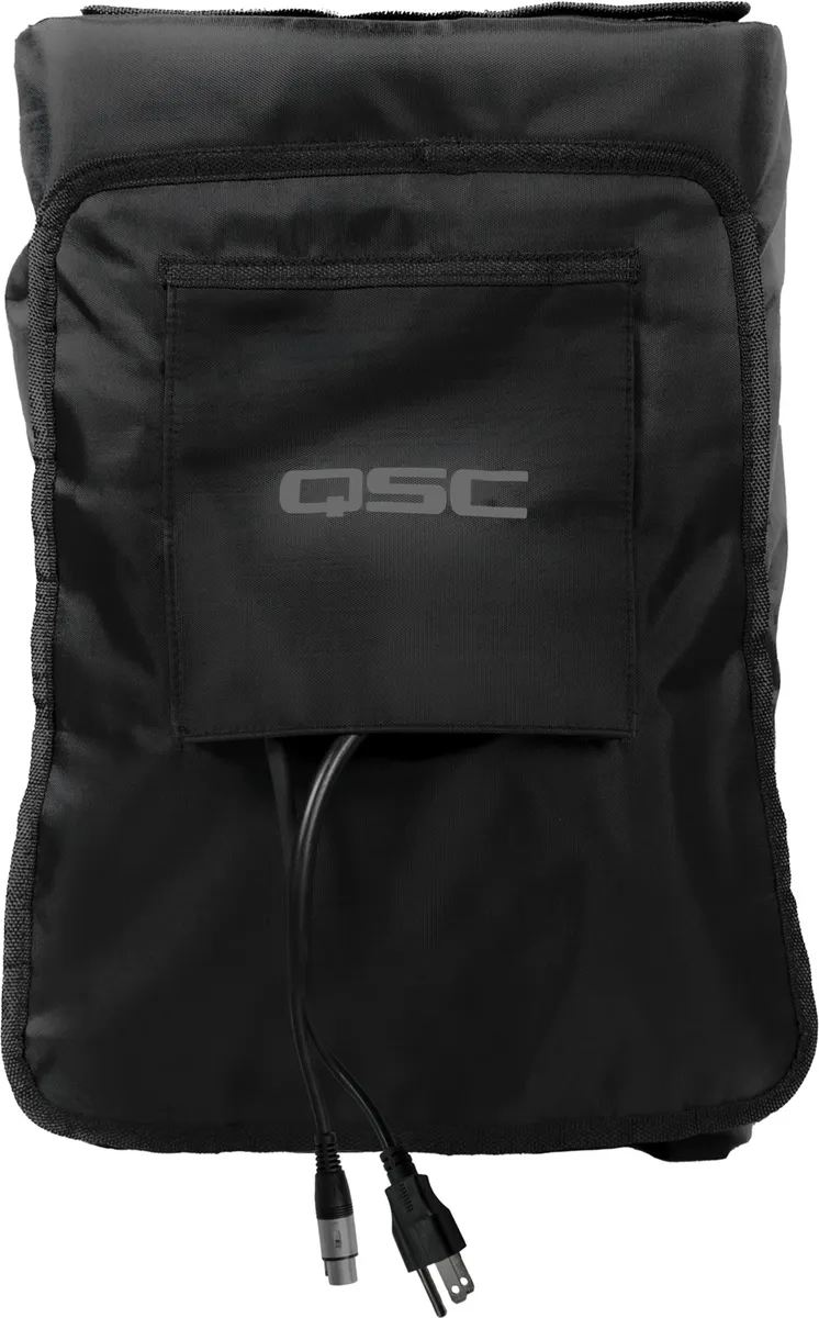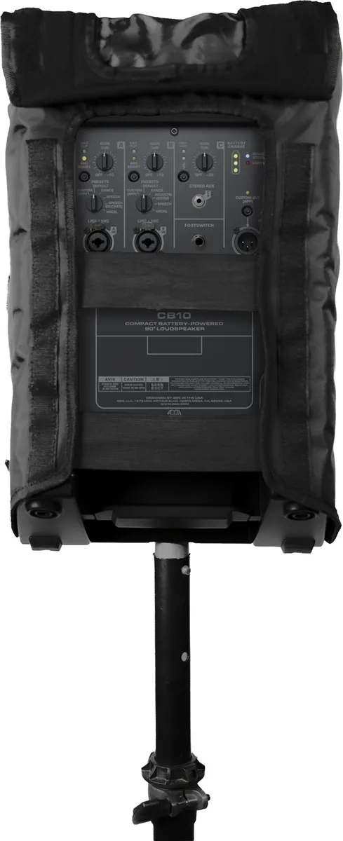 Nylon fabric and hydrophobic mesh cover for transport and temporary outdoor use of CB10 active loudspeaker in adverse weather. Removable amplifier panel allows access to connectors and controls. Vented panel maintains airflow for proper heat management. Not intended for permanent outdoor installations.