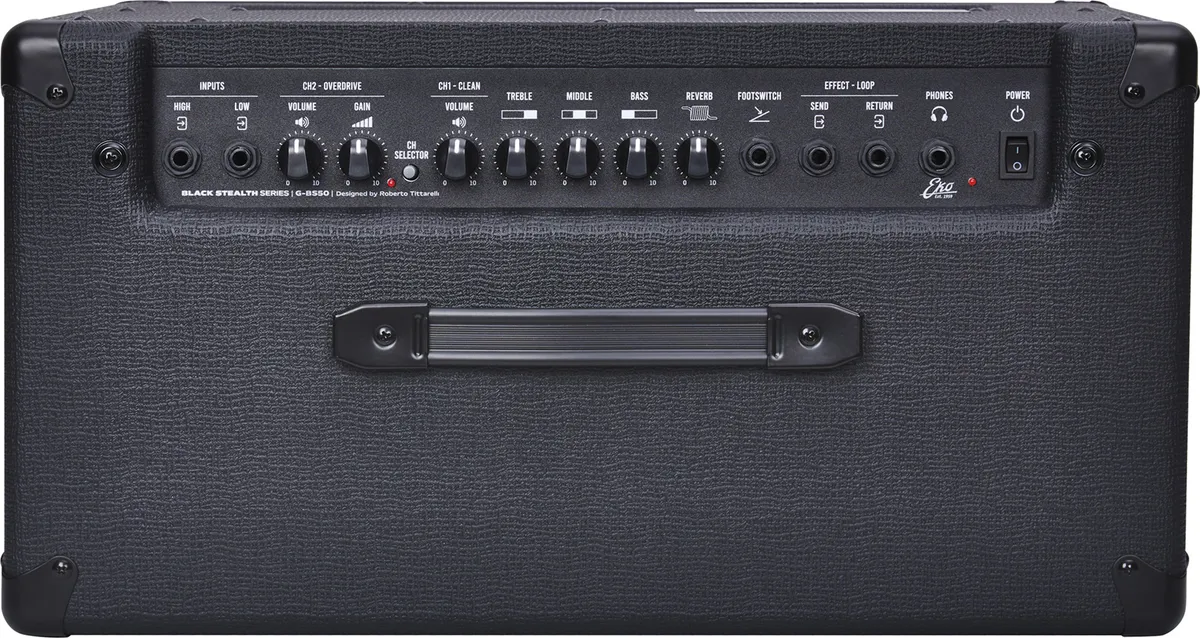 Stealthy but powerful!The G-BS50 was developed by Eko, in partnership with technician Roberto Tittarelli, to offer guitarists a powerful and versatile transistor combo. This amp delivers 50W through a 12-inch speaker and allows you to tackle a variety of sounds and styles of music thanks to its two selectable channels (clean and drive), for clear or more saturated sounds. The reverb effect is perfect for adding depth to your sound, for a sound that won't go unnoticed.Complete for any use !The G-BS50 features a comprehensive interface: a volume control for the clean channel, complemented by a classic three-band EQ, and gain and volume controls for the overdrive channel. A switch allows you to select the desired channel, but this can also be done via the footswitch input (not included). In addition to the two guitar inputs (High for passive pickups, Low for active pickups), this amp includes a headphone output for discreet practice when needed. Finally, an effects loop also allows you to insert your guitar effects pedals to enhance your sound.The Eko G-BS50 is a complete guitar combo for experienced guitarists looking for a versatile amp for home, rehearsals/gigs, or studio, at an affordable price.