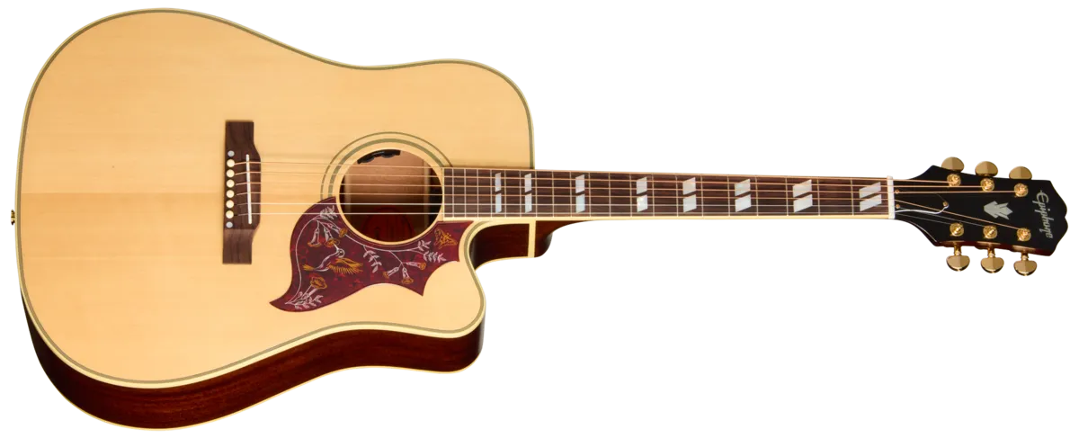 The Gibson Hummingbird was Gibson's first square-shouldered acoustic model and has been one of the world's best-loved and most instantly-identifiable acoustic guitars since it was first introduced in 1960. Renowned for its versatility, it's equally at home playing first-position chords or punchy acoustic lead lines, and has been used in a wide range of musical genres by countless artists.Now, Epiphone is very proud to introduce the Hummingbird Standard EC, an Inspired by Gibson version of the world-famous Hummingbird with some notable updates that make this iconic guitar better than ever. The Hummingbird Standard EC features all solid wood construction, including a solid mahogany back and sides that are paired with a solid spruce top, which is the classic Hummingbird tonewood recipe that delivers all the sweet tones the Hummingbird is famous for. The body features a cutaway that makes this 'bird even more expressive and allows for easier access to the upper regions of the fretboard. The mahogany neck is equipped with a rosewood fretboard that is outfitted with 20 standard frets and adorned with beautiful mother-of-pearl split parallelogram inlays. The belly-up bridge is also rosewood, and the saddle and nut are bone. The newly-redesigned pickguard is the epoxy style and features the iconic hummingbird, butterfly, and flowers graphics that are a visual hallmark of the Hummingbird. Quality Grover® Rotomatic® tuners ensure solid tuning stability, so you can spend more time playing and less time tuning up. When you do need to tune up, the onboard Fishman® electronics include a built-in tuner, as well as side-mounted controls for volume and EQ, making this Hummingbird ready for use on-stage and in the studio. A premium gig bag is also included to help keep the Hummingbird Standard EC safe and for easy grab-and-go transport to your next jam session, rehearsal, or gig.A battery is not included. To power your pickup, you will need a 9-volt battery.