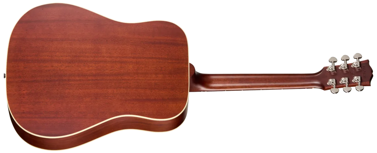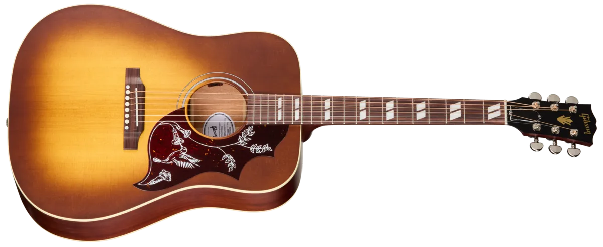 First introduced in 1960, the Gibson Hummingbird™ is one of the most distinctive and well-loved acoustic guitars ever made. Handcrafted with care in Bozeman, Montana, by Gibson's expert acoustic luthiers, the new Gibson Hummingbird Special offers players a USA-built Gibson Hummingbird model at a very attractive price. The Hummingbird Special has a traditional square-shouldered body constructed using genuine solid mahogany for the back and sides and a solid Sitka spruce top that is reinforced with our traditional scalloped X-bracing. This combination of tonewoods delivers a warm, balanced tone with excellent dynamic range that is perfect for any style of music. The "concert depth" body is slightly thinner than the body on a Hummingbird Standard, giving it a leaner and tighter bass response that sits perfectly in the mix and also makes it easier to hold. The utile neck is attached to the body with a compound dovetail neck-to-body joint, and like all Gibson acoustic guitars, it is affixed with hot hide glue. The neck has a comfortable Round profile, and the rosewood fretboard has a 12" radius and features pearloid parallelogram inlays, which is one of the visual hallmarks that makes the Hummingbird easily recognizable. The fretboard is fitted with 20 standard frets. The traditional belly-up rosewood bridge is equipped with a TUSQ® saddle, and the nut and bridge pins are also TUSQ. High-quality Grover® Rotomatic® tuners ensure rock-solid tuning stability. The pickguard features a simplified version of the world-famous Hummingbird pickguard graphics. The Hummingbird Special is finished in satin nitrocellulose lacquer in your choice of Satin Ebony, Satin Natural or Satin Honey Burst. It comes equipped with an L.R. Baggs ™ Element Bronze under-saddle piezo pickup and active preamp with an easily accessible soundhole-mounted volume control, so it's stage and studio-ready from the moment you take it out of the included premium soft shell case.