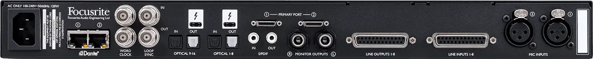 Red 8Line has a total of 58 inputs and 64 outputs, including two Red Evolution mic pres, independent L/R monitor outs, eight balanced line inputs and outputs on DB25 connectors; 32 channels of Dante I/O; 16-channel ADAT input and output (at 48kHz), and stereo S/PDIF input and output. As with other Red interfaces, it features professional-grade 24-bit/192kHz A-D and D-A conversion for no-compromise, mastering-quality recording and audio playback. With 119dB dynamic range A-D and 121dB dynamic range D-A (A-Weighted), the converters have been expertly selected and calibrated by Focusrite to provide the best balance of sound quality, dynamic range and conversion latency.