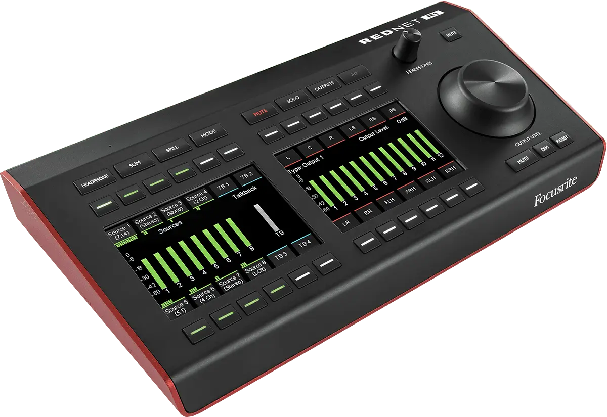 RedNet R1 is a desktop remote controller that supercharges any Red range interface, by enabling audio professionals to interact with their audio like never before. It can control a range of different monitor output setups, ranging from mono through to 7.1.4 surround, including Dolby Atmos® and other immersive audio workflows. Alternatively, completely custom setups of up to 12 outputs can be configured for bespoke speaker configurations.