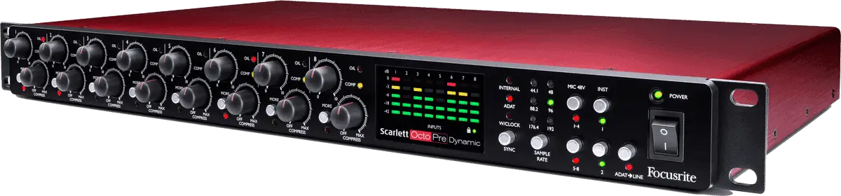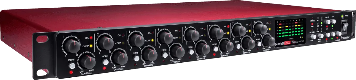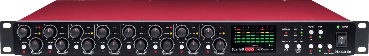 The Focusrite Scarlett OctoPre Dynamic expands your setup with eight additional 2nd-generation Scarlett mic preamps, and per-channel analog compression for control over your dynamics. Also onboard is Focusrite's high-res 24-bit/192kHz AD/DA conversion. OctoPre Dynamic gives you eight line outputs to feed your analog rig, along with ADAT optical I/O to expand any ADAT-equipped interface. OctoPre Dynamic's pristine Focusrite preamps, high-quality conversion, and expansion capabilities make it the ideal way to grow your studio.