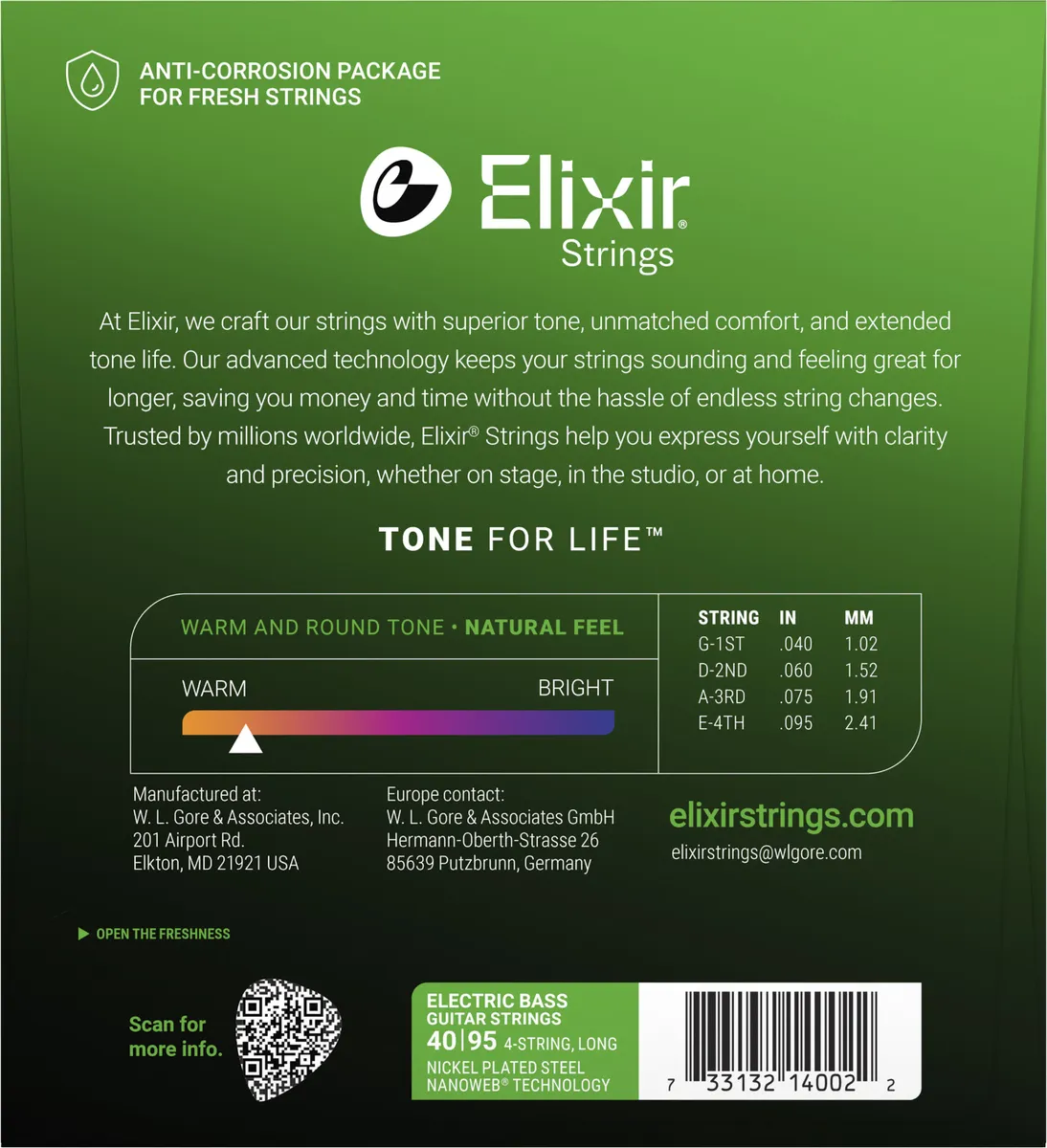Elixir® Nickel Plated Steel Bass Strings with a NANOWEB® Coating deliver a rich, rounded tone with greater clarity and heavier mid-range presence.