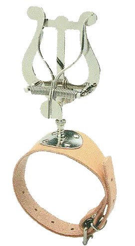 Bracelet en cuir se fixant sur l'avant-bras gauche. Tige et lyre métal.