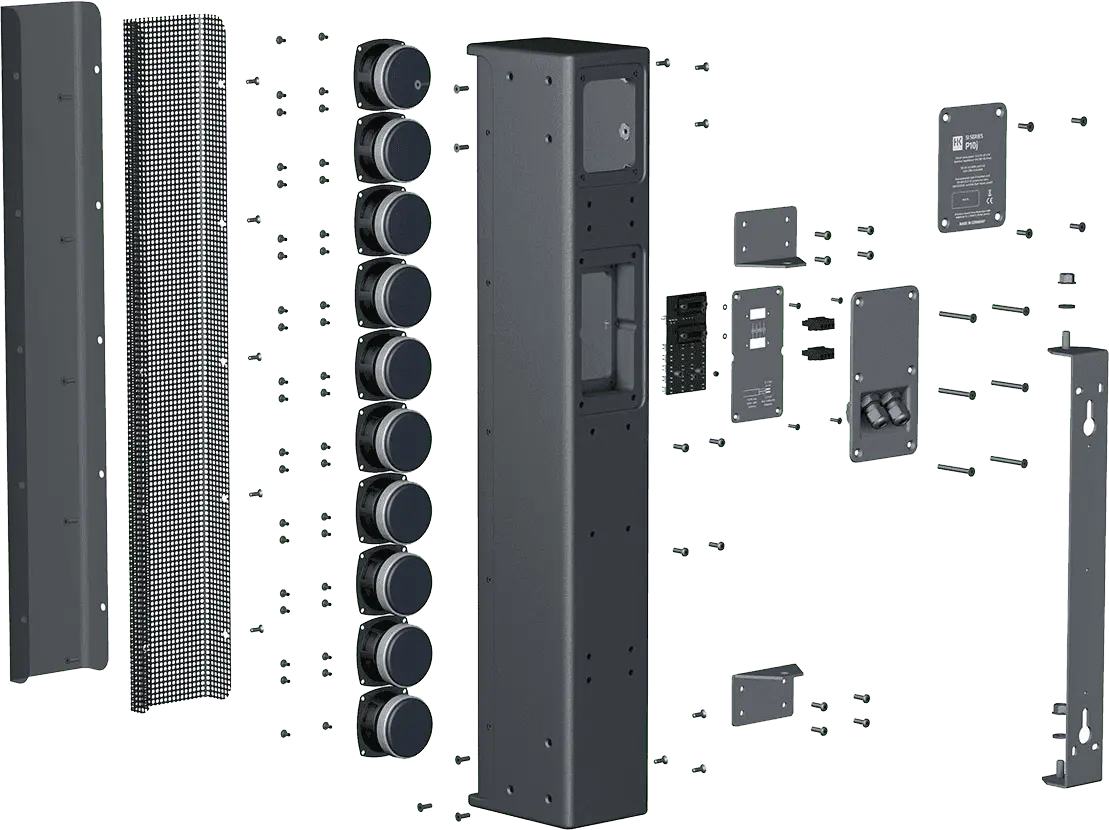 Professional column loudspeaker for installations with a closed cabinet, loaded with 10 x 3“ fullrange drivers with 600 W program power rating. Extensive mounting accessories for outdoor and indoor installations and very high max. sound pressure level for demanding environments. Symmetrical directivity, combinable with SI SERIES P10j for precise coverage for difficult rooms or for outdoor long-throw applications.