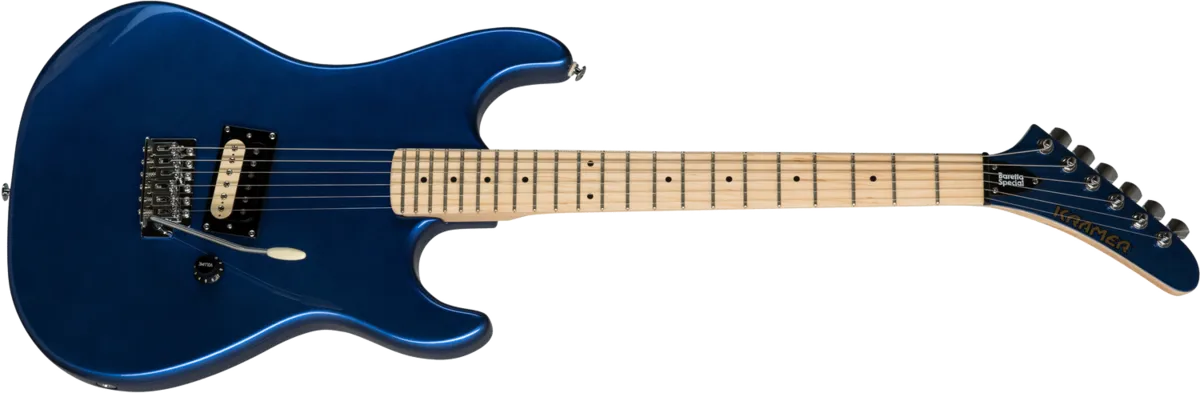 The Baretta Special features a tone-rich Mahogany body. The Slim Profile bolt-on Maple neck has a Maple fingerboard with black dot inlays with double dots at the 12th fret, a 12" radius, 25.5" scale, and 22 medium jumbo frets. The traditional Kramer headstock (in matching finish) has a truss rod with a ‘bullet’ cover with Baretta Special in white and the historic Kramer logo.