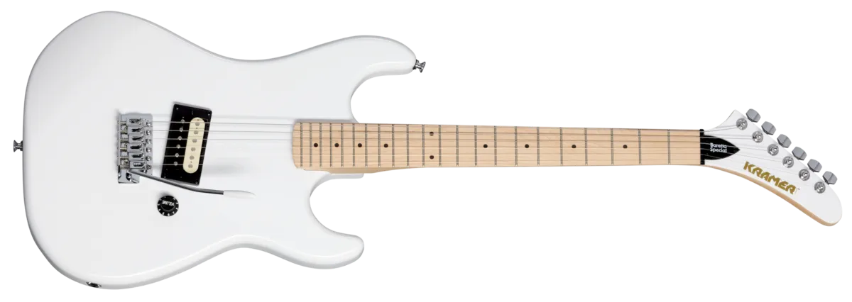 The Baretta Special from the Kramer Original Collection is a great way for new players to discover one of the most influential guitars in rock history at a price anyone can afford! Featuring a powerful Alnico 5 “zebra-coil” humbucker with a single volume control, a tone-rich mahogany body, maple neck, and a Kramer Traditional tremolo.