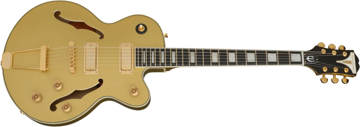 The new UpTown Kat™ ES Collection is the next generation of Epiphone’s classic “Kat” archtop and features a true ES style semi-hollowbody archtop with newly designed Epiphone ProBucker™ FB720 mini humbuckers™, Graph Tech® nut, Ebony fingerboard, and Grover® Rotomatic tuners. Available in Sapphire Blue Metallic, Ruby Red Metallic, Emerald Green Metallic, and Topaz Gold Metallic.