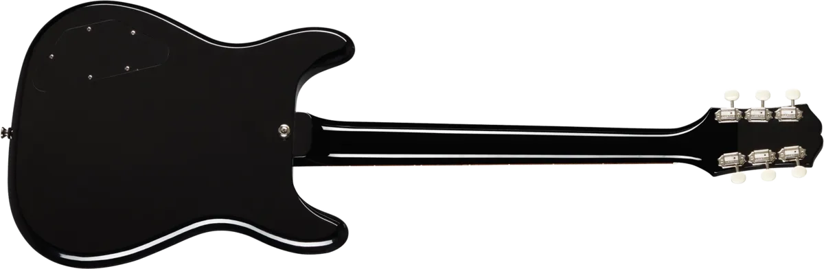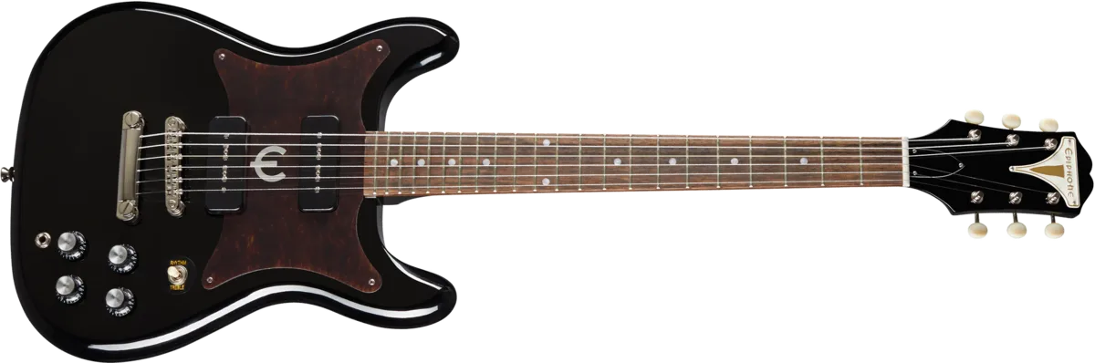 From its first appearance in 1959 the Wilshire™ has been one of Epiphone's most successful original solid body electric guitar designs. The Wilshire P-90 brings back many of the features of the earliest Wilshire models including the symmetrical double-cutaway mahogany body with dual PRO P-90 Soapbar pickups, three on a side reduced sized Kalamazoo headstock with Epiphone Bikini badge and ivory button Epiphone Deluxe tuning machines, and a butterfly tortoise shell pickguard with foil E logo. The Wilshire P-90 comes equipped with a glued-in mahogany neck with a medium C profile, Indian laurel fretboard with 12" radius and 22 medium jumbo frets, 2 volume and 2 tone controls and an Epiphone LockTone™ Tune-O-Matic™ bridge and Stop Bar tailpiece, and is available in classic Cherry and Ebony finishes.
