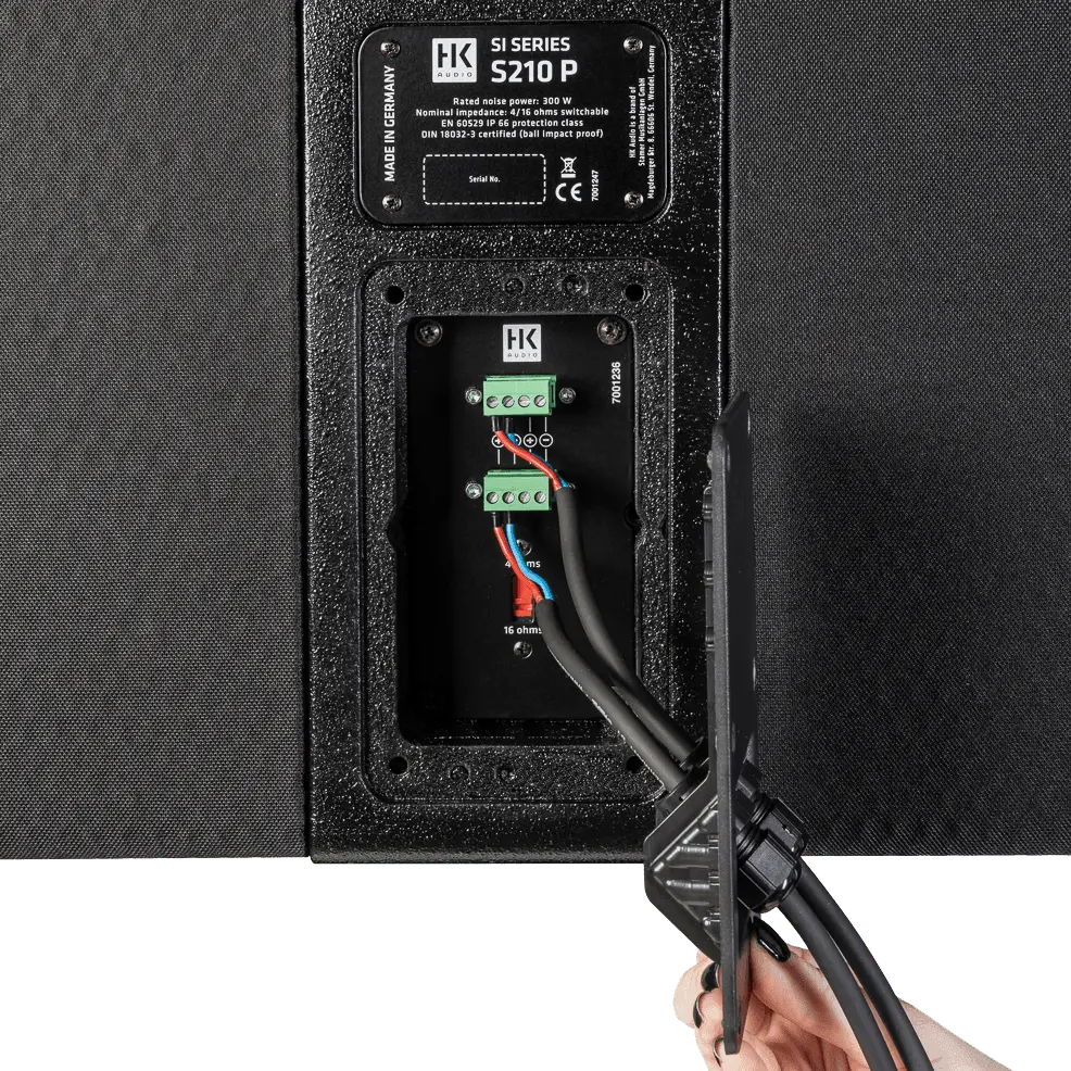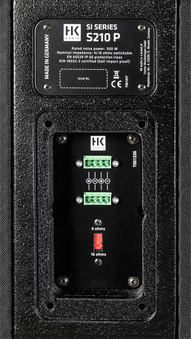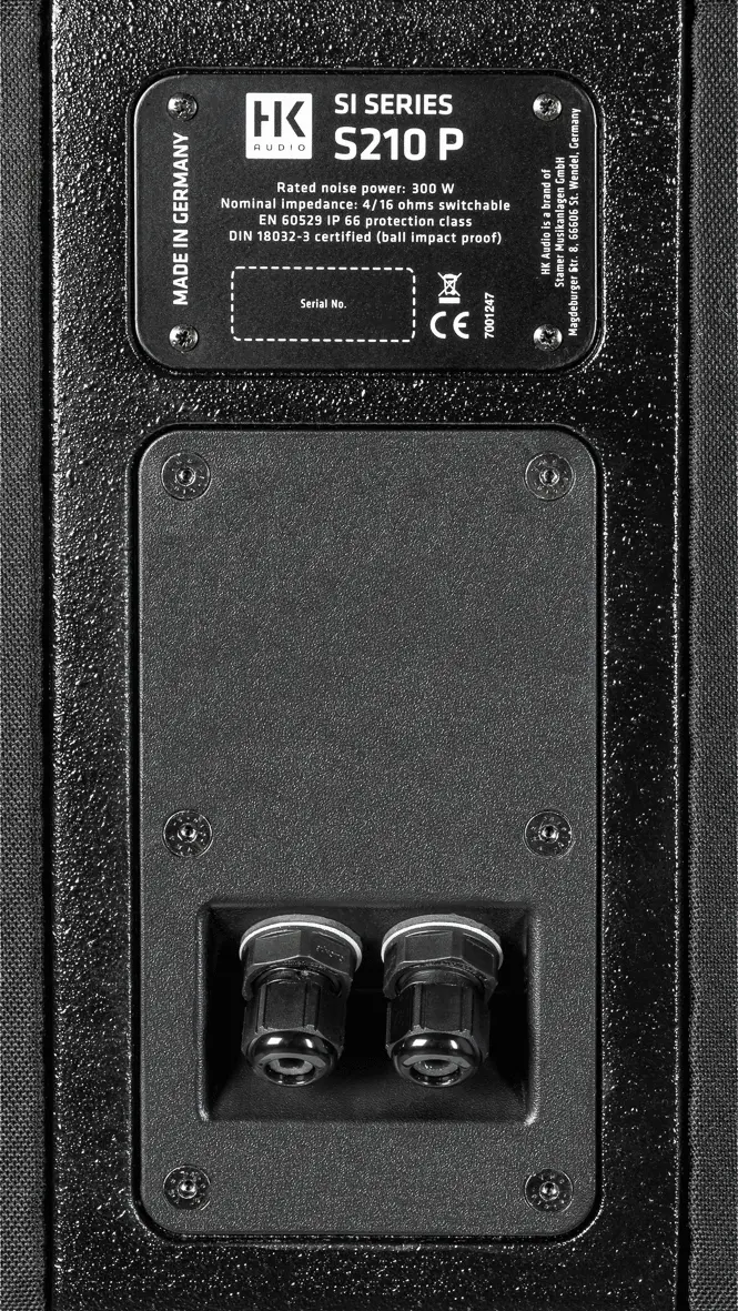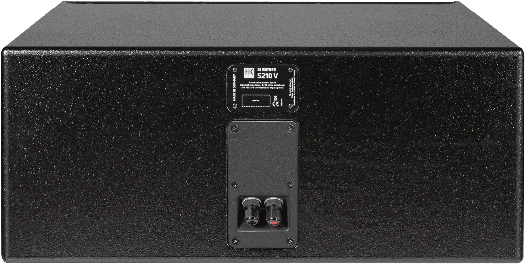 Passive high-performance subwoofer for installations, 1200 W (program), switchable impedance (4 ohms or 16 ohms), 2×10″ transducers and bass reflex port with exponential contour, 124 dB max. SPL (10 % THD), 44 Hz – 140 Hz (-10 dB), 2x 4-pin connectors, IP 44 rating