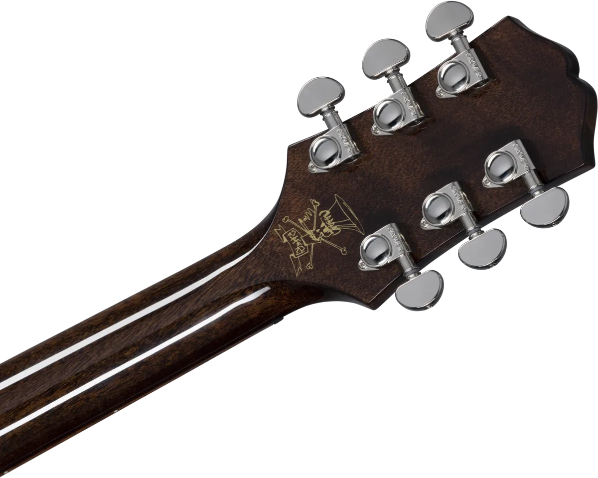 Epiphone and Slash are proud to present the Slash Collection. Part of the Inspired by Gibson Collection, it celebrates influential guitars Slash has used during his career, inspiring multiple generations of players around the world. Perfect for every stage and players of all levels, the Epiphone Slash J-45 features all solid wood construction with solid mahogany back and sides, a solid Sitka spruce top with a 50s-style pickguard, Grover Rotomatic tuners, Graph Tech TUSQ nut and saddle, and Slash’s personal touches including a C-shape neck profile, a flatter, more modern 16" fretboard radius, and an LR Baggs VTC preamp and under-saddle pickup for natural acoustic sound when plugged in. Exclusive to the Slash Collection are Slash's “Skully” signature drawing on the back of the headstock and Slash’s signature on the truss rod cover. A custom hardshell case with Slash's "Skully" logo is also included.
