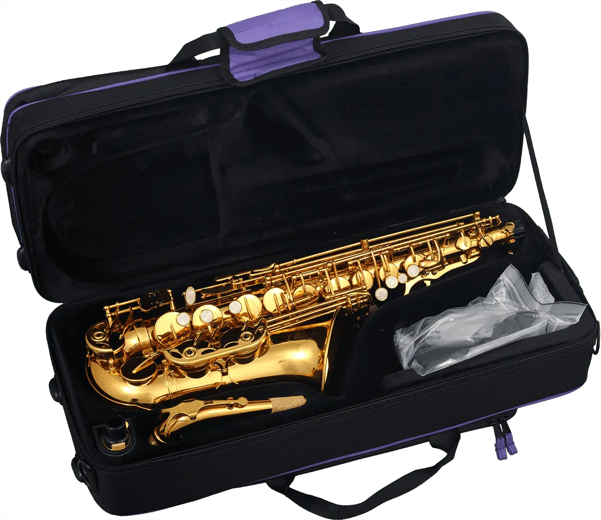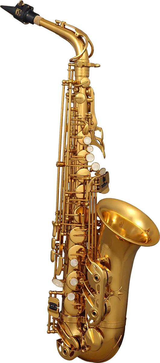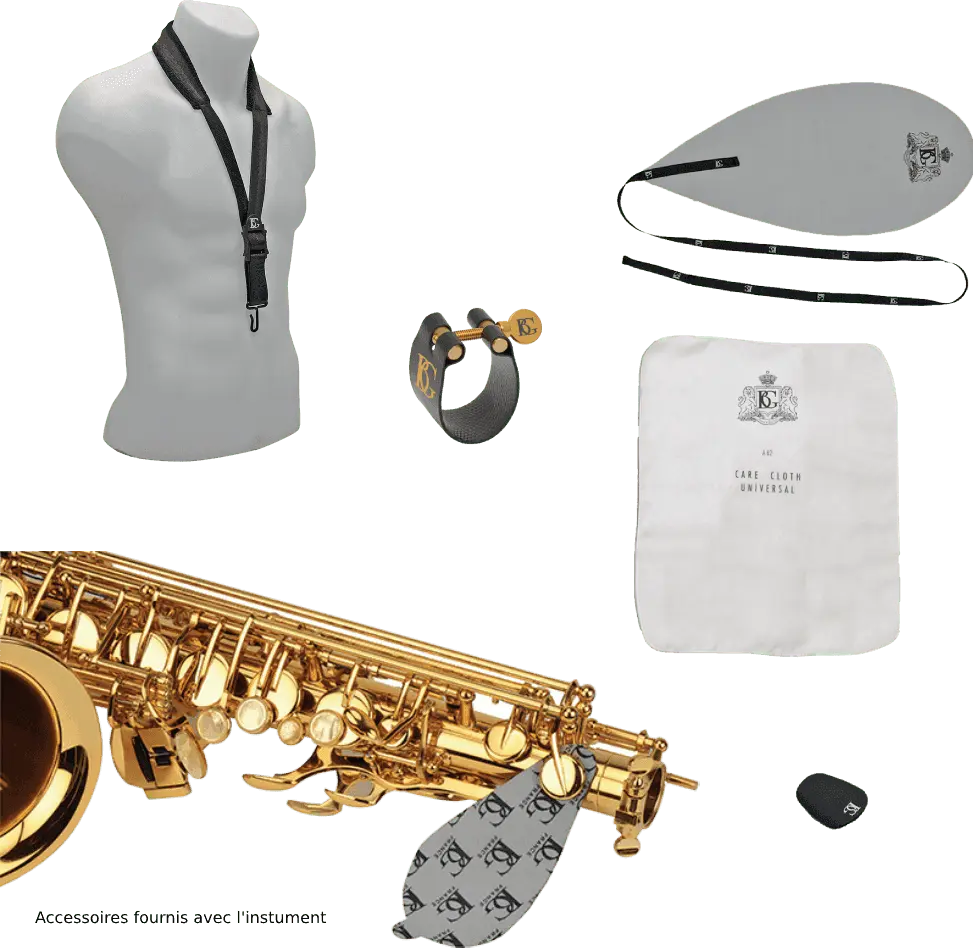 Eb, gold lacquer engraved bell. Adjusting screw on both hands. Double arm on C - B - Bb. Ergonomic left finger table. Metal thumb rest. Vivo bocal.