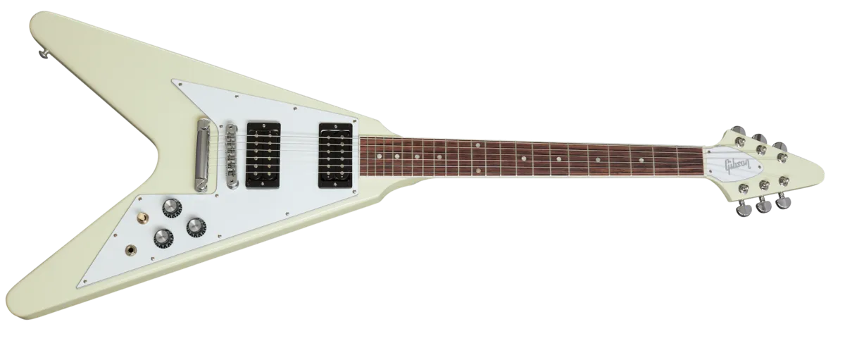 The iconic 70s classic is ready to take flight again. With its bound rosewood fingerboard, SlimTaper™ neck, and a pair of uncovered 70s Tribute humbuckers™ hand-wired with Orange Drop® capacitors, this Flying V™ is set to nail all of the classic tones of the era. Available in a Classic White finish with matching headstock, the silver reflector knobs and chrome hardware makes this guitar ready to rock any arena stage.
