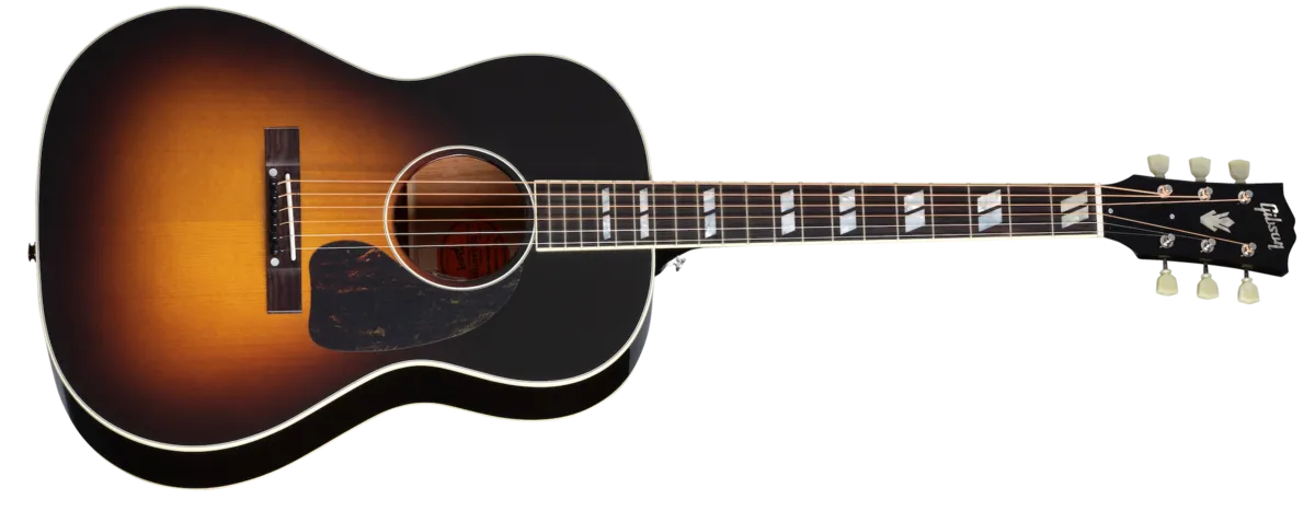 Nathaniel Rateliff's music, both solo and with the Night Sweats, incorporates a uniquely appealing blend of folk, soul, Americana, and R&B. His new Gibson LG-2 Western is also a blend of Nathaniel's own vintage Gibson LG-2 and Country Western. The smaller-sized mahogany body and Adirondack red spruce top deliver vintage-approved tone. The 24 3/4" scale length bound mahogany neck features split parallelogram inlays, and the headstock is crowned with a mother of pearl Gibson block logo and Crown inlay, a nod to the Country Western, while the nickel Gotoh Keystone tuners and black bridge pins are reflections of Nathaniel's personal guitar. The volume and tone controls of the onboard LR Baggs® VTC electronics are mounted at the bottom of the soundhole, per Nathaniel's preferences; the LR Baggs pickup makes the Nathaniel Rateliff LG-2 Western stage-ready, right out of the included hardshell case.
