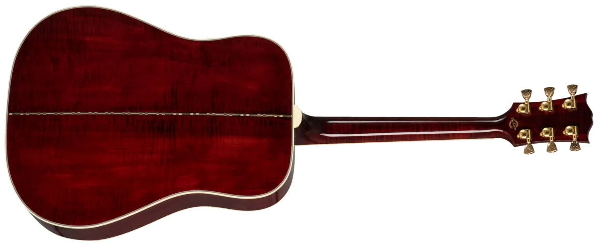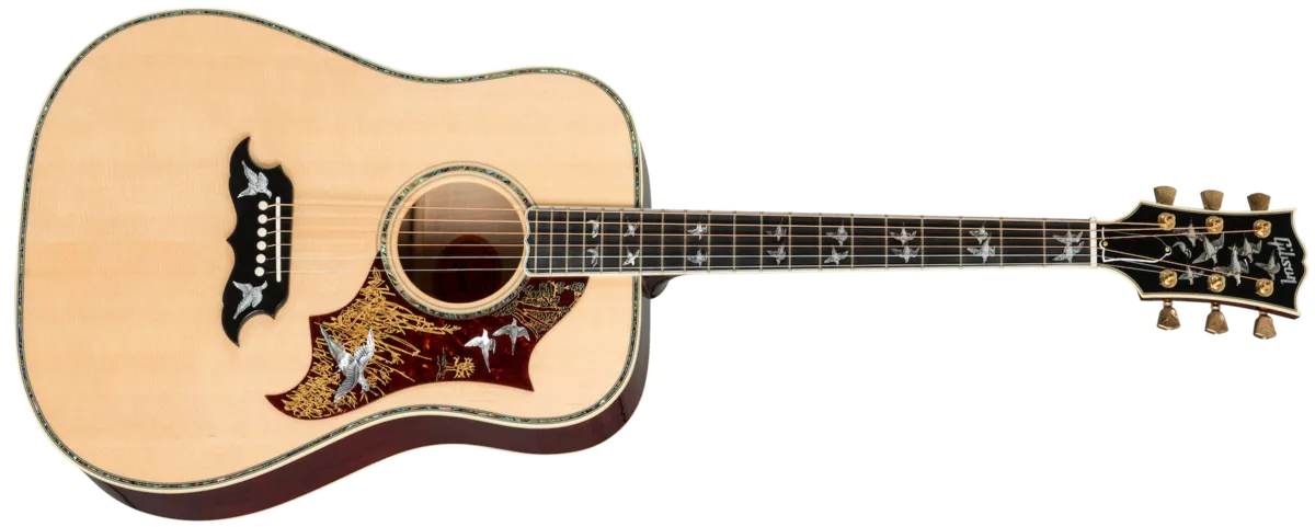 The Doves in Flight incorporates the features of the legendary Dove with some of the finest decorative work in the industry. The Doves in Flight displays 28 individually engraved dove inlays—seven on the headstock, 16 on the fingerboard, three on the pick guard, and two on the bridge—each with its own original design. Each tuner knob is hand engraved for full detail. Now hand built using premium ebony on the fingerboard and bridge.