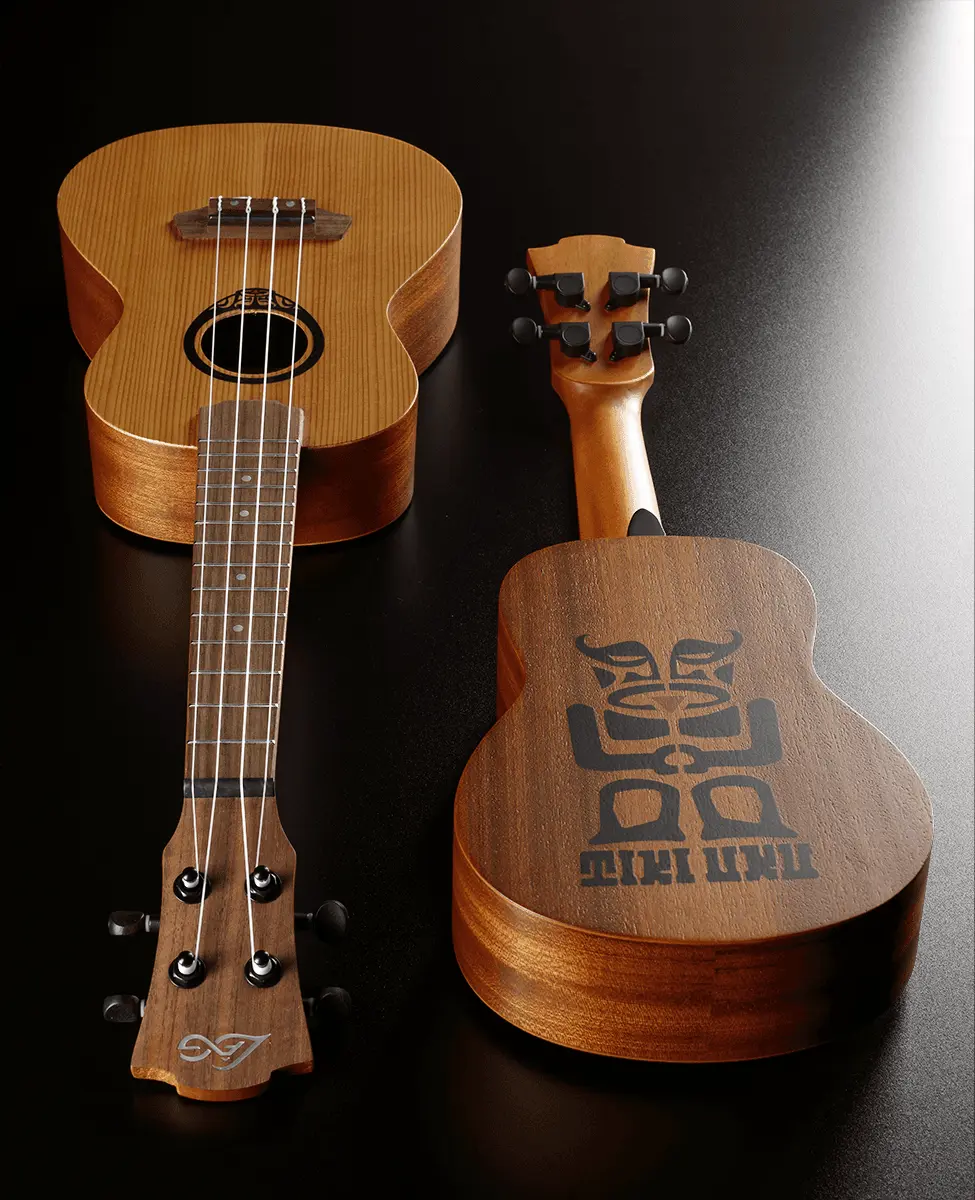 The walnut fingerboard and bridge combine durability with a smooth touch. The graphite nut and saddle guarantee precise intonation, while the die-cast tuners ensure long-lasting stability. The satin finish underlines the natural character of the woods, while the engraved Tiki Uku logo on the arched back adds identity and charm.