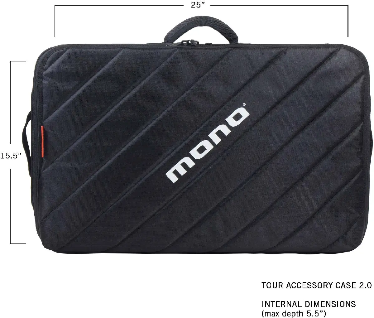 The Tour Accessory Case 2.0 is sized to fit the Medium pedalboard by MONO, but will fit other similar pedalboards as well. If you are unsure about the fit for your pedalboard, make sure it does not exceed any of the maximum inner dimensions shown here. Please contact us before commissioning a custom board - the rounded corners of our cases can affect the way some boards fit.