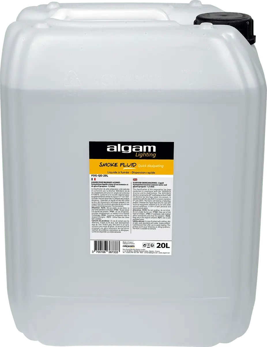Quick dissipation is an essential part of smoke effects. Also known as the "geyser" or "CO2" effect, this smoke provides a genuine eye appeal. Algam Lighting fluids are manufactured in France according to an extremely strict process, in compliance with all the legal standards for these products. Reliable and efficient, Algam Lighting fluids are compatible with most machines on the market.