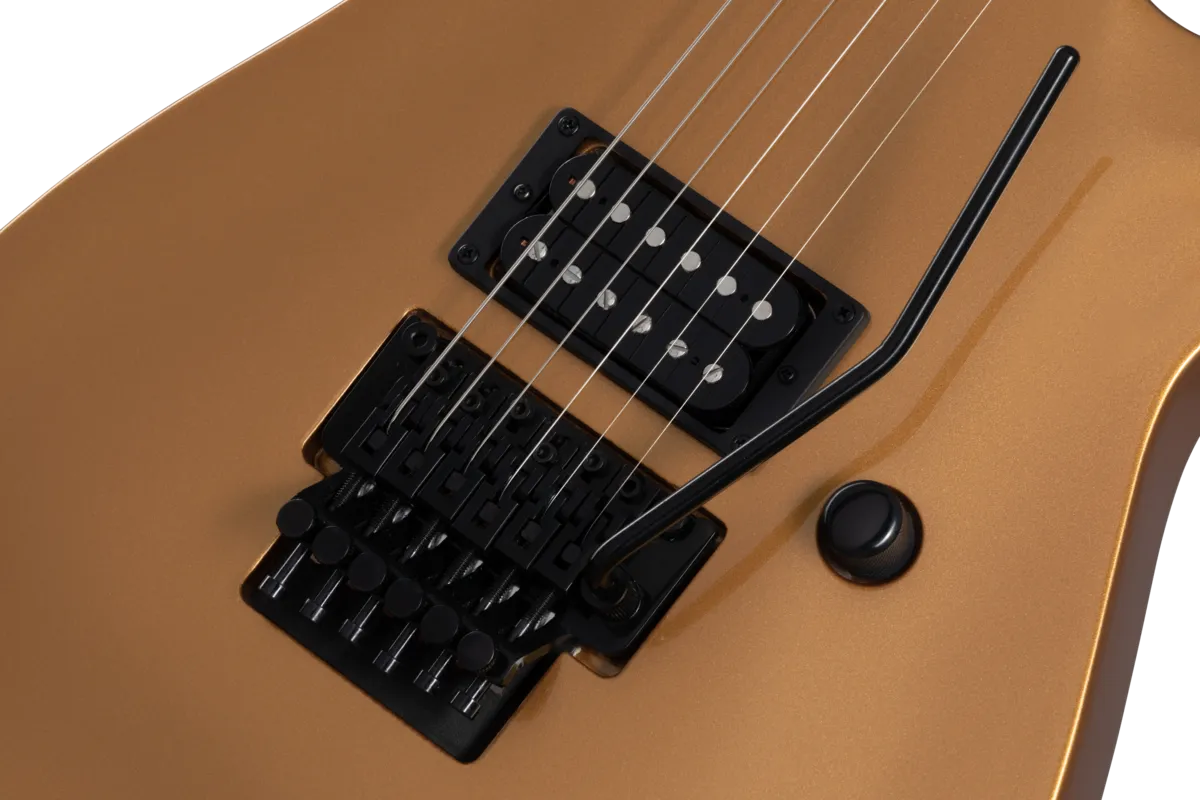 The SM-1 H is an exciting new version of the SM-1 and an updated version of the original Kramer Stagemaster Mach II. It retains the neck-through, double-cutaway mahogany body, ebony fingerboard, and Floyd Rose® 1000 series tremolo and R2 1000 series locking nut of the original SM-1, but has simplified electronics consisting of a single volume control with push/pull series/parallel switching and a Seymour Duncan® JB™ humbucker™ in the bridge position. Available in Buzzsaw Gold, Shockwave Purple, and Tronius Silver.
