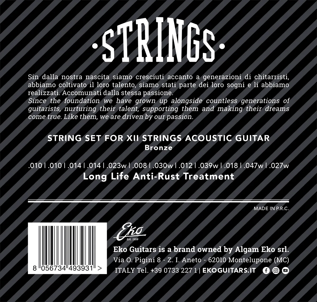 12 pcs roundwounded bronze steel strings, for 12-string acoustic guitar.Gauge: .010 .010 .014 .014 .023w .008 .030w .012 .039w .018 .047w .027