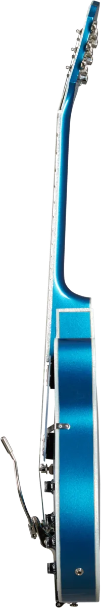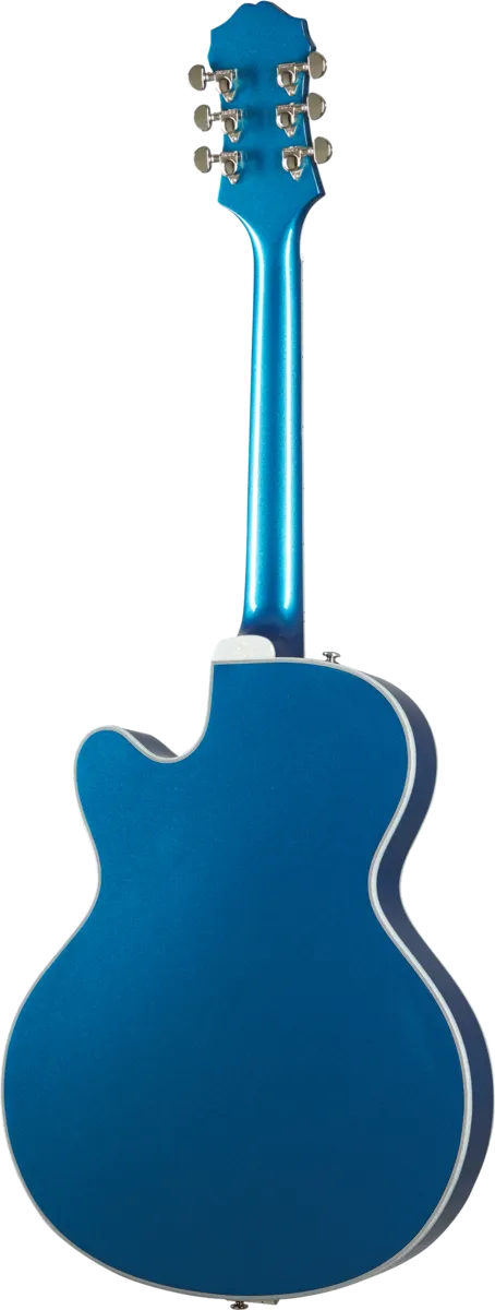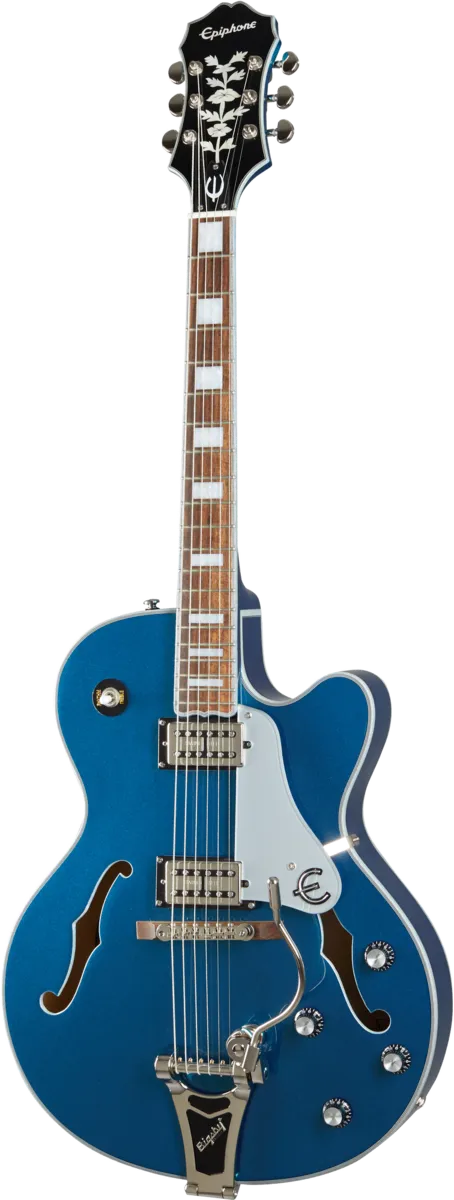 The Epiphone Emperor Swingster™ is a way-cool guitar that excels in a wide range of genres, including jazz, blues, rockabilly, country and rock. This hollowbody has a 5-ply layered maple body, mahogany neck with a comfortable and fast-playing SlimTaper™ profile, Indian laurel fretboard with block inlays, mother of pearl Epiphone and Tree of Life inlays on the large Clipped Dove Wing headstock, Grover® Rotomatic® tuning machines, and two Epiphone SwingBucker™ pickups, each with a dedicated volume and tone control. Push/pull switches are built into each volume control to provide series/parallel switching for the pickups, and along with the 3-way toggle pickup selector switch, give you a broad selection of tonal options. The LockTone™ Tune-O-Matic™ bridge is mounted on a pinned wooden base so it won't move out of place when you use the licensed Bigsby® vibrato with wire handle. Available in Forest Green Metallic with gold hardware, or Black Aged Gloss and Delta Blue Metallic finishes with nickel hardware.