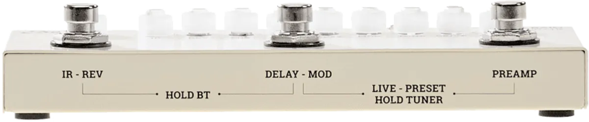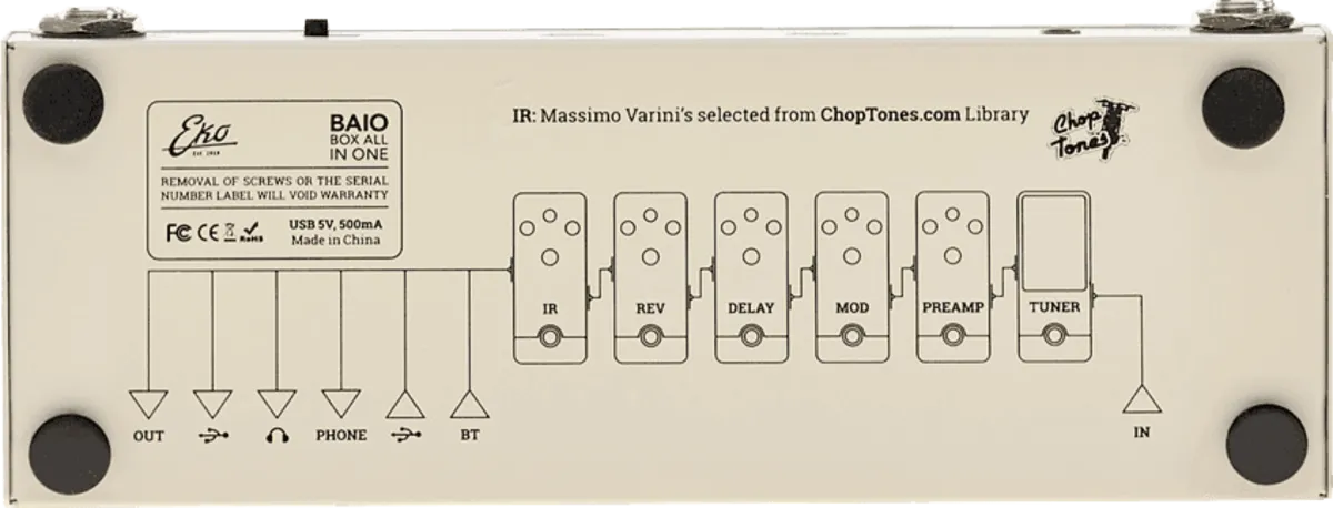 With nine selectable preamp types, controllable with the Tone and Drive knobs, you will have access to just as many timbres ranging from crystal clear to heavier distortions. The Modulation section, accessible via the Mod knob, allows you to add Chorus and Phaser; Delay effect with relative management of Delay Time, feedback, Mix and Reverb effect are accessible respectively with the Delay, FB, Mix and Rev knobs. The IR knob allows you to select from eight Impulse Responses specifically created for BAIO by Massimo Varini, who has selected and adapted some of the best ChopTones IRs. From Blues to Metal you will have the opportunity to use live and in the studio a selection of amplifiers, cabinets, speakers and microphones specially combined to offer a realistic convincing sound. Through the Out control you will be able to adjust the Output Volume and using the three footswitches you can switch from Preset Mode - for changing the Presets - to Live Mode, where you could set IRs / Rev, Delay / Mod and Preamp separately. With the footswitches, you can also activate the Bluetooth that will allow you to play your favorite backing tracks through an external device or activate the integrated Tuner, with which it is also possible to completely interrupt the Output signal (Mute function).