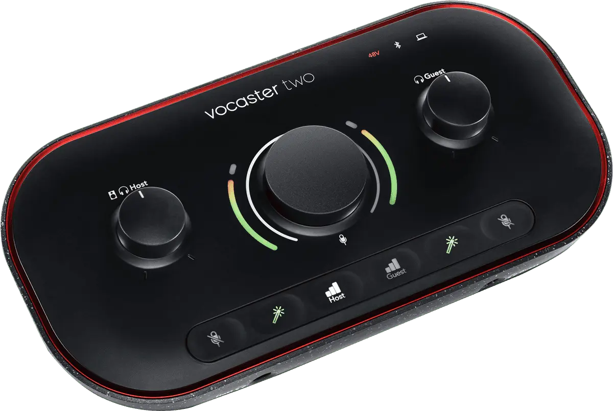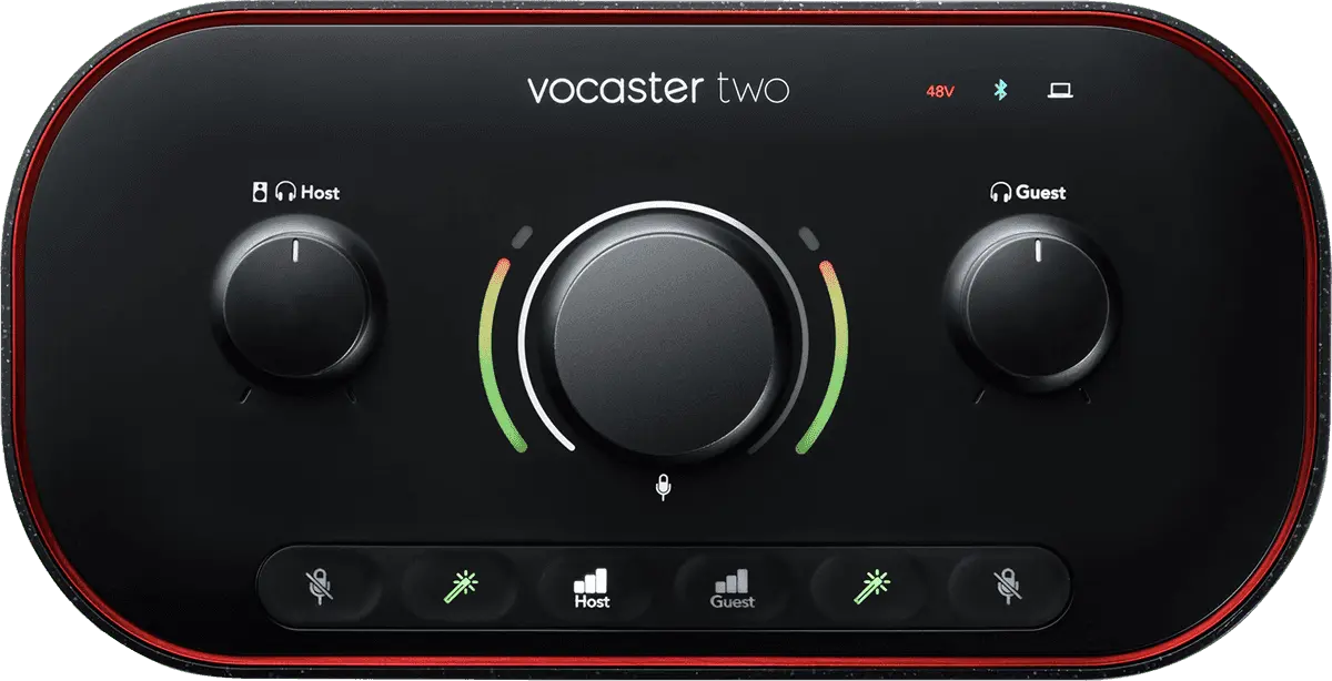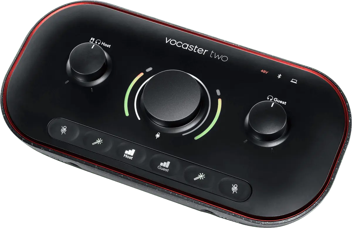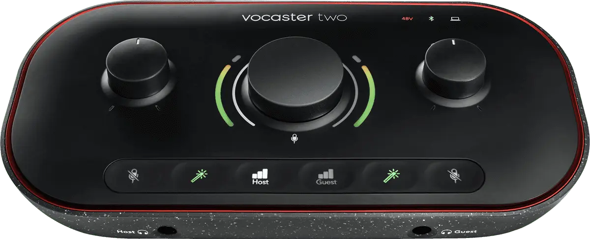 Vocaster Two in seconds. Get your podcastsounding pro with Auto Gain, Enhance, two micand two headphone connectors, Bluetooth audiofrom your phone, and more.