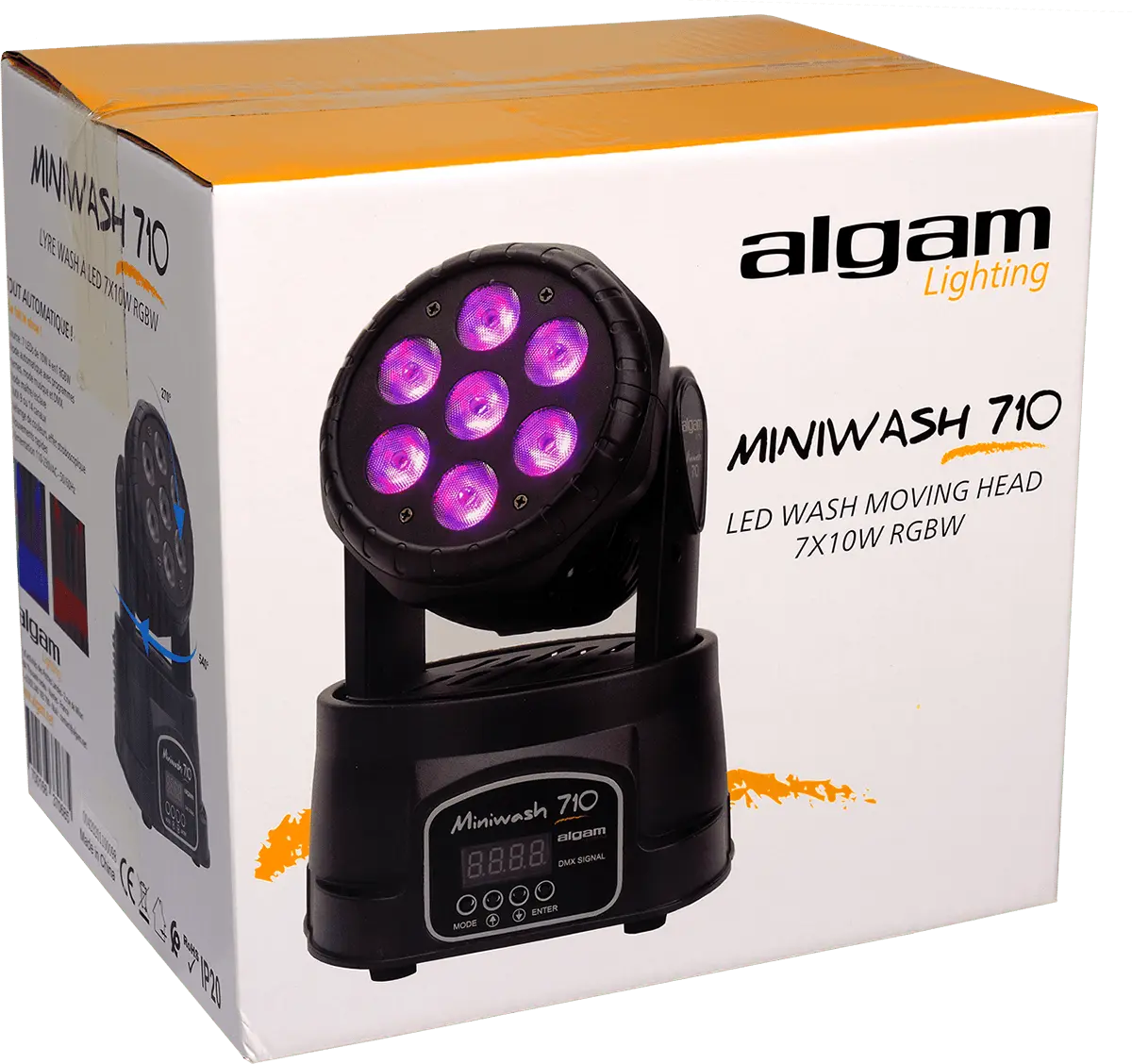 Powerful but compact, the wash moving-head MINIWASH 710 from Algam Lighting has 7 RGBW LEDs for generous and warm light beams. Packed with features for amazingly energetic effects, operating in automatic, music-controlled or DMX mode, it has quiet and stealthy motors that offer pan up to 540° and 270° tilt, ensuring a variety of head-turning moves.