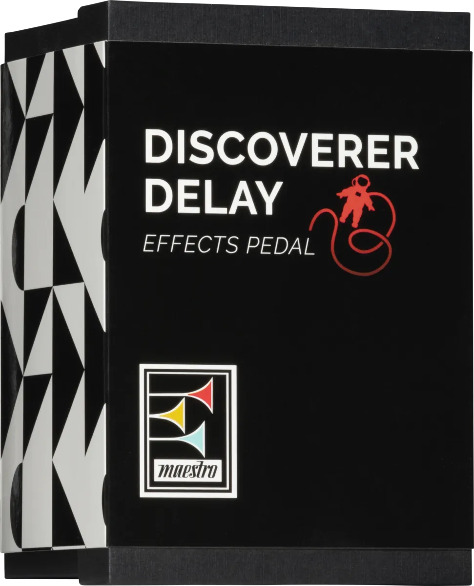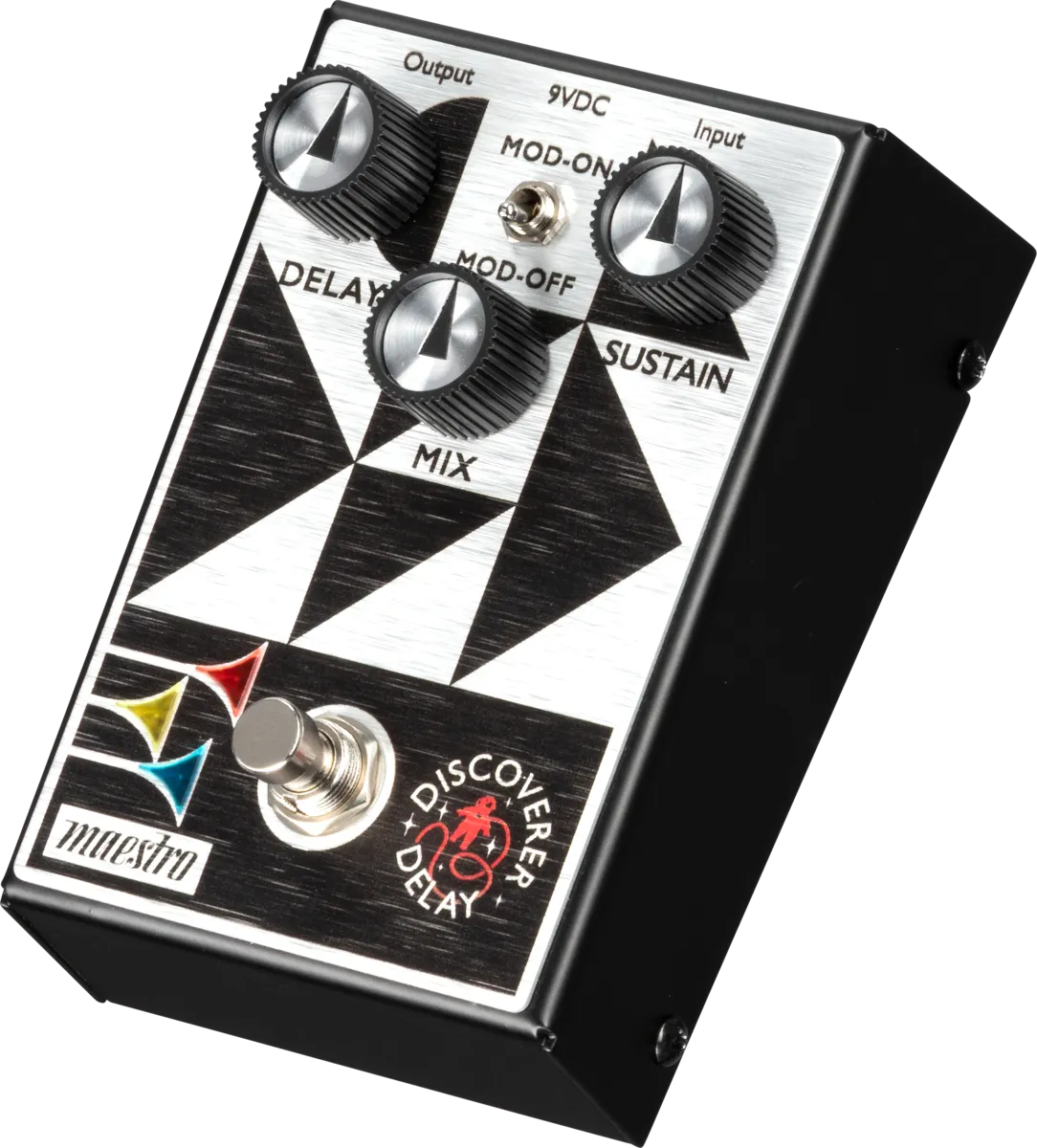 The Maestro Discoverer Delay is a modern analog delay pedal that proudly utilizes legendary analog bucket brigade device (BBD) technology to deliver classic, warm, and inviting delay sounds. The intuitive 3-knob control layout lets users quickly dial up the length of the Delay time (with a range from 20 ms to 600 ms), the amount of Sustain (delay repeats), and adjust the level of the delays in the Mix. A toggle switch engages built-in modulation that applies anything from a slightly saturated, tape-like wow and flutter effect to a heavily pitch-shifted modulation effect to the delayed signal. Two internal trim pots allow the user to adjust the Rate (speed) and Width (sweep range) of the modulation. The true bypass footswitch triggers the LED lights in the bugles in the Maestro logo when it’s on, so you’ll always know when the effect is active.