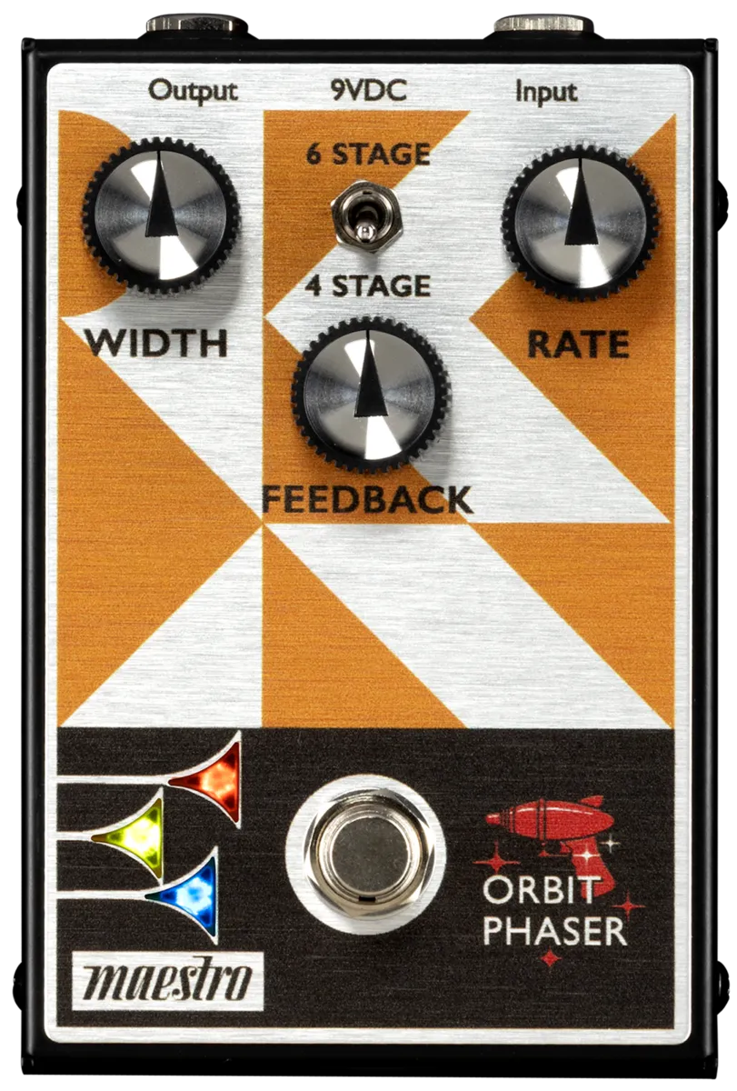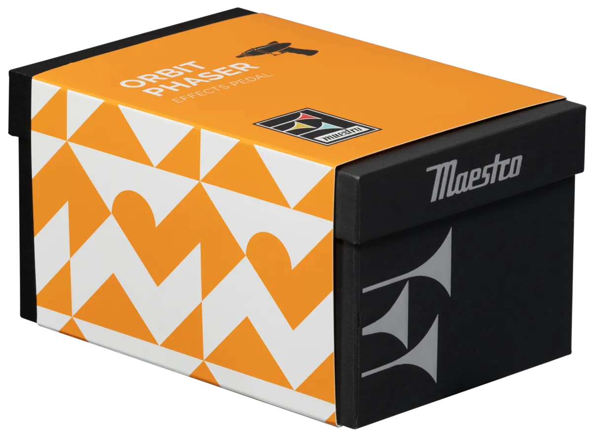 The Maestro Orbit Phaser is a descendent of the very first phaser pedal ever produced - the legendary Maestro PS-1. This classic effect has been re-engineered and tailored to the needs of today’s players. The Maestro Orbit Phaser is designed to optimize all the character and vibe you expect from an all-analog phaser. Warm and smooth, the Maestro Orbit Phaser offers all the versatility needed to dial in the tastiest of phaser effects. Its two-position Mode switch gives you a choice of 4 or 6-stage phasing. The intuitive 3-knob control layout lets you quickly set the desired Width (the intensity of the phaser effect), Feedback (emphasizing the amount of vocal phase effect), and adjust the Rate (speed) of the phasing effect. The true bypass footswitch triggers the LED lights in the bugles in the Maestro logo when it’s on, so you’ll always know when the effect is active.