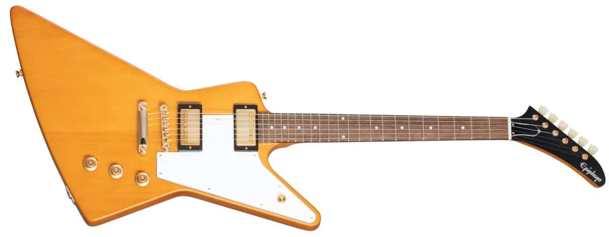 Made in partnership with the Gibson™ Custom Shop, the 1958 Korina Explorer™ is Epiphone’s impressive recreation of one of the most famous and valuable vintage guitars ever made. It brings authentic 1958 Explorer details to guitarists everywhere at a breakthrough price. Like the ultra-rare original Gibson models from 1958, it features a solid Korina body and a Korina neck with a long neck tenon and a 1958 Explorer neck profile. It is also equipped with an Indian laurel fretboard and gold hardware. The electronics are also top-notch, with Gibson Burstbucker™ 2 and Burstbucker 3 pickups wired to individual volume controls and a master tone control with CTS® pots and a Mallory™ capacitor, along with a Switchcraft® 3-way pickup selector switch and 1/4” output jack. An Epiphone x Gibson Custom logo on the back of the headstock is also proudly displayed, and a hardshell case is also included.