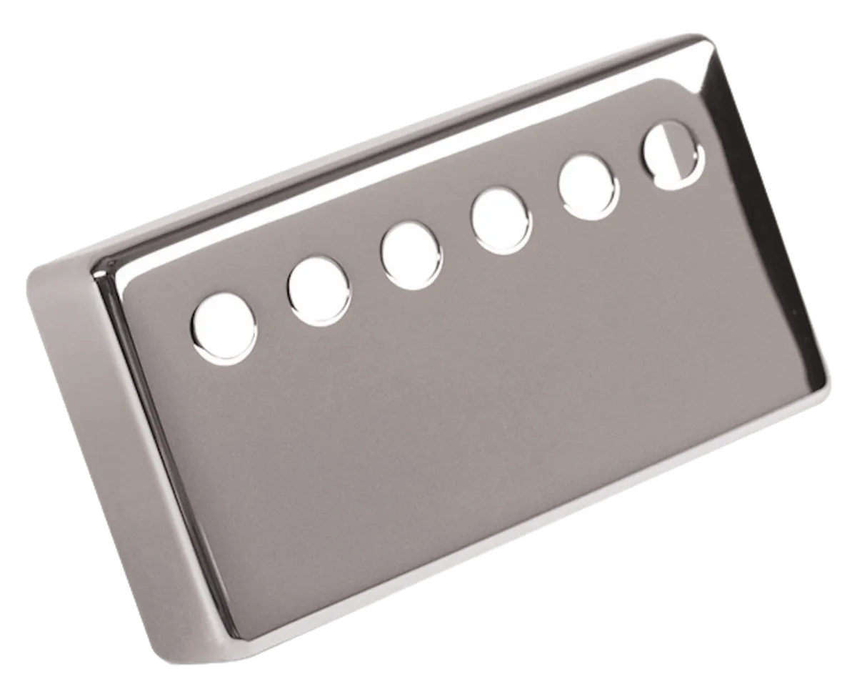 An original OEM replacement or restoration pickup cover that fits perfectly over neck position Gibson humbucker, with a measurement of 50 mm between the centers of the outside poles.