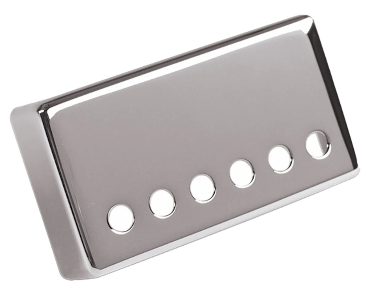 An original OEM replacement or restoration pickup cover that fits perfectly over bridge position Gibson humbucker, with a measurement of 52 mm between the centers of the outside poles.