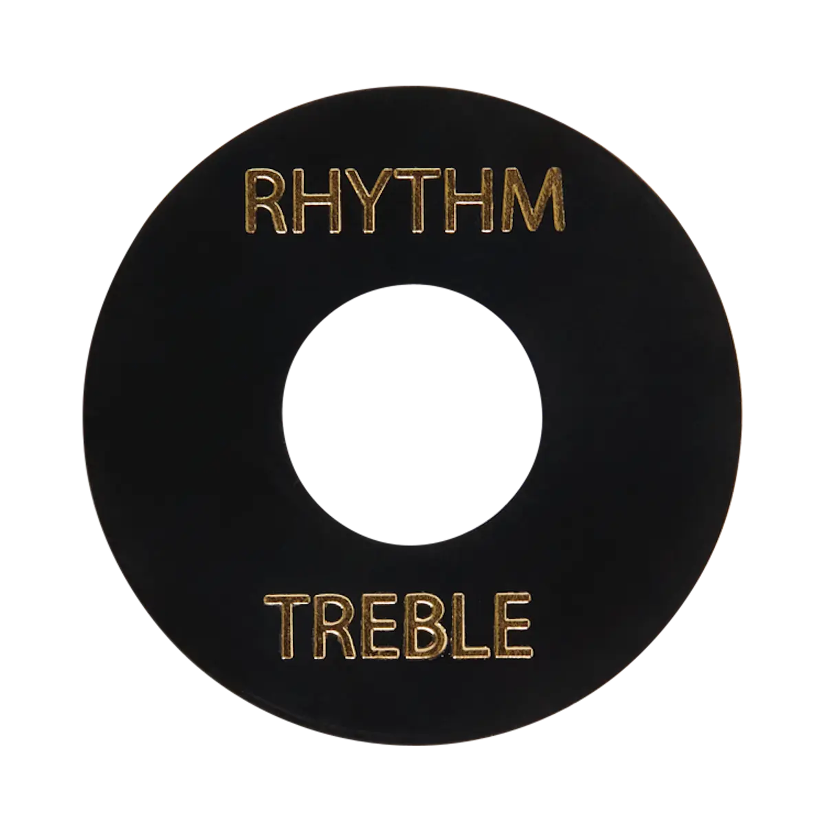 An exact replacement for worn out toggle switch washers, securely fitting over the switch shaft and held in place by the nut. This OEM part is made from ABS plastic and available in either black or crème, both with the gold imprinted letters "RHYTHM" and "TREBLE".