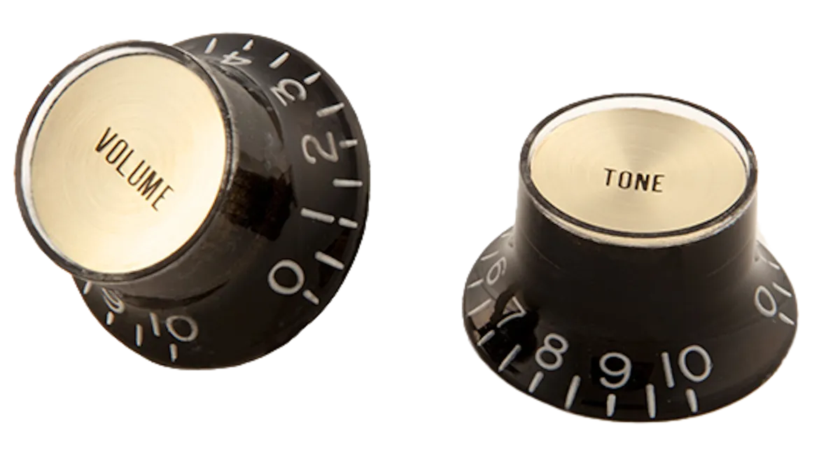 These genuine Gibson OEM top hat style knobs are the same knobs found on many Gibson SG models, but can also be used for any vintage restoration project, changing your guitar's look, or for the replacement of lost knobs. These black Gibson top hat style knobs with silver metal inserts come packaged in sets of four: two volume and two tone.